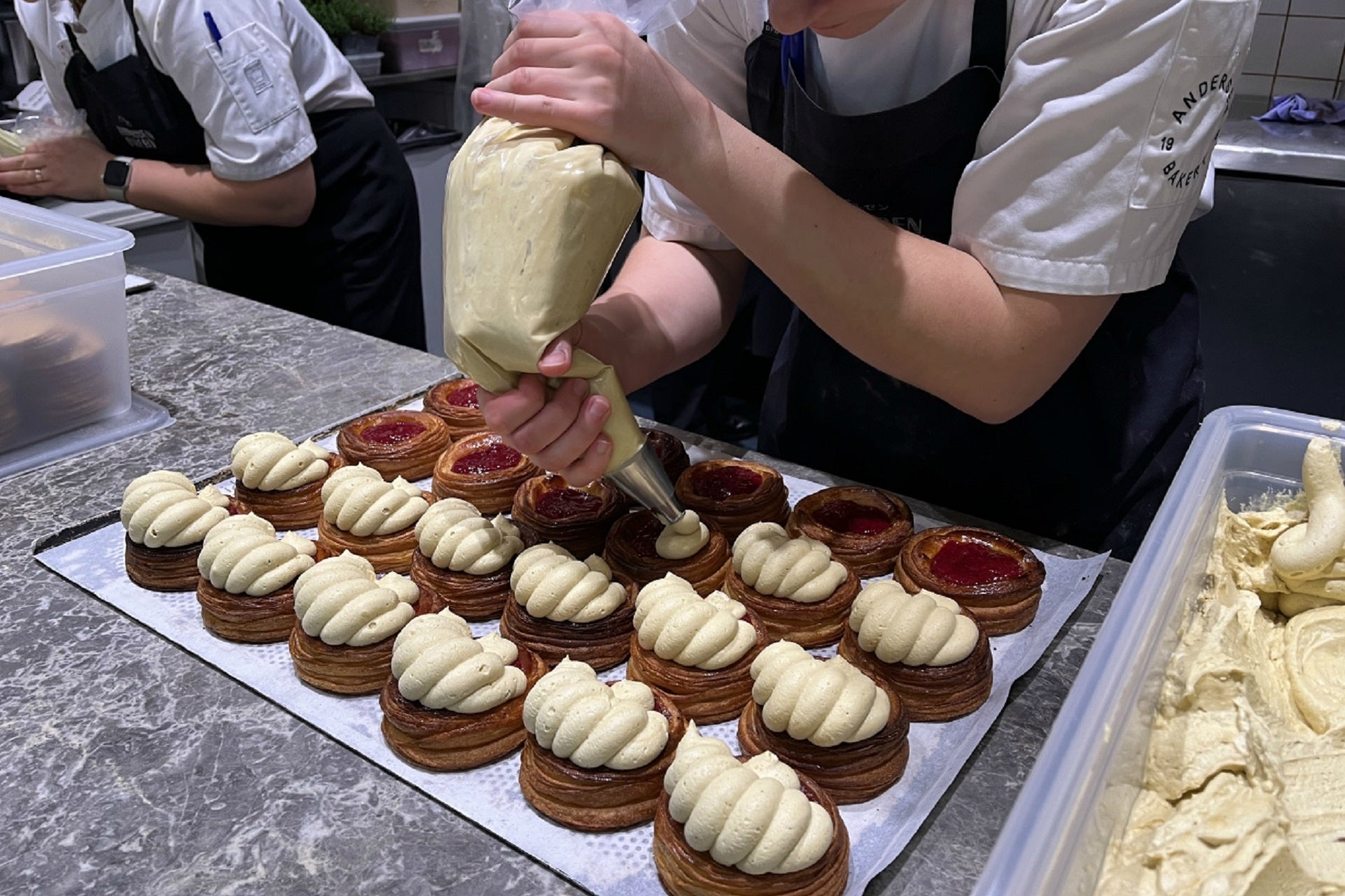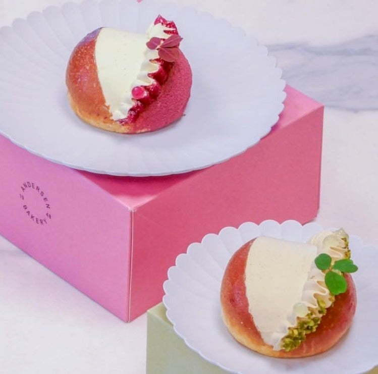 ファステラウンボーラといえば、伝統的なガメルタイプ(クリームやマジパンを包んで焼き上げ、グレーズ等で仕上げたもの)が主流でしたが、2020年にアンデルセン・デンマーク店がスタイリッシュにアレンジしたモダンタイプを発売。その新しさが人気を呼び、ファステラウン時期には外に行列ができるほどになりました。他のベーカリーも新しいタイプを次々に発売。2023年にはデンマークの新聞「Politiken」で、デンマークで最もおいしいファステラウンボーラにアンデルセンが選ばれました。