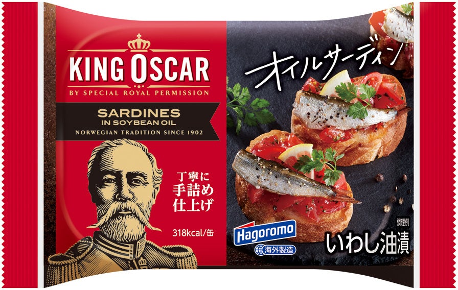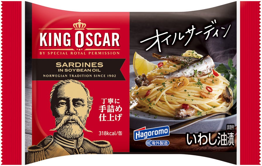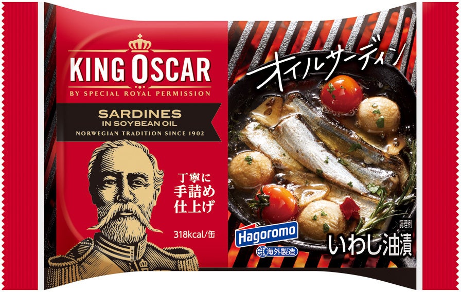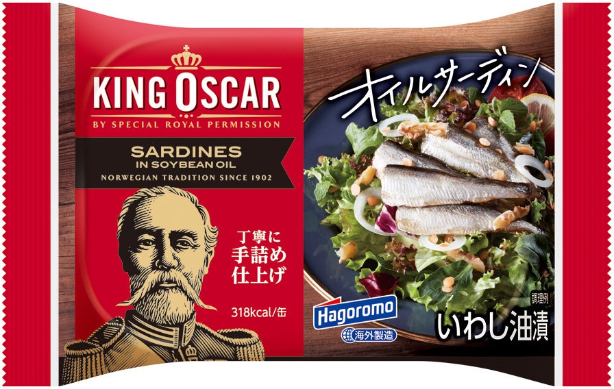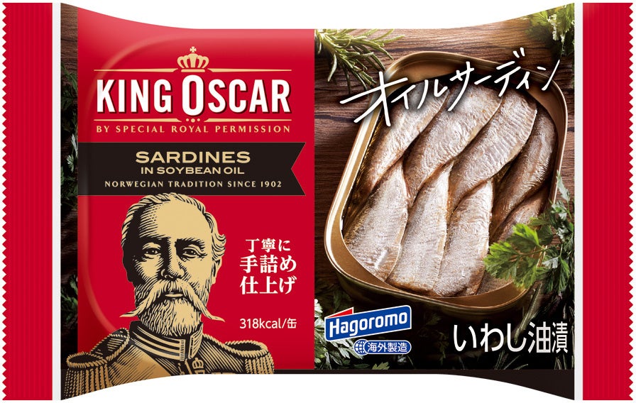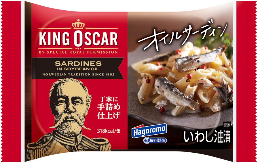 キングオスカー オイルサーディンは、1902年ノルウェーとスウェーデンの統一王であるキングオスカーⅡ世より、特別な許可を与えられ誕生しました。国王が認めたオイルサーディンは、今ではヨーロッパ・北米・オーストラリア・アフリカ・アジアなど世界各地で販売されています。当社は2010年から「はごろも&キングオスカー オイルサーディン」として日本国内で販売を始めました。今回は、こだわりの伝統製法やおいしさはそのままに、大幅にパッケージデザインを変更。パッケージデザインは全6種類、オイルサーディンそのものやアレンジメニューを大きく印刷し、お客様が手に取って“食べてみたい”と思っていただけるようなデザインにしました。