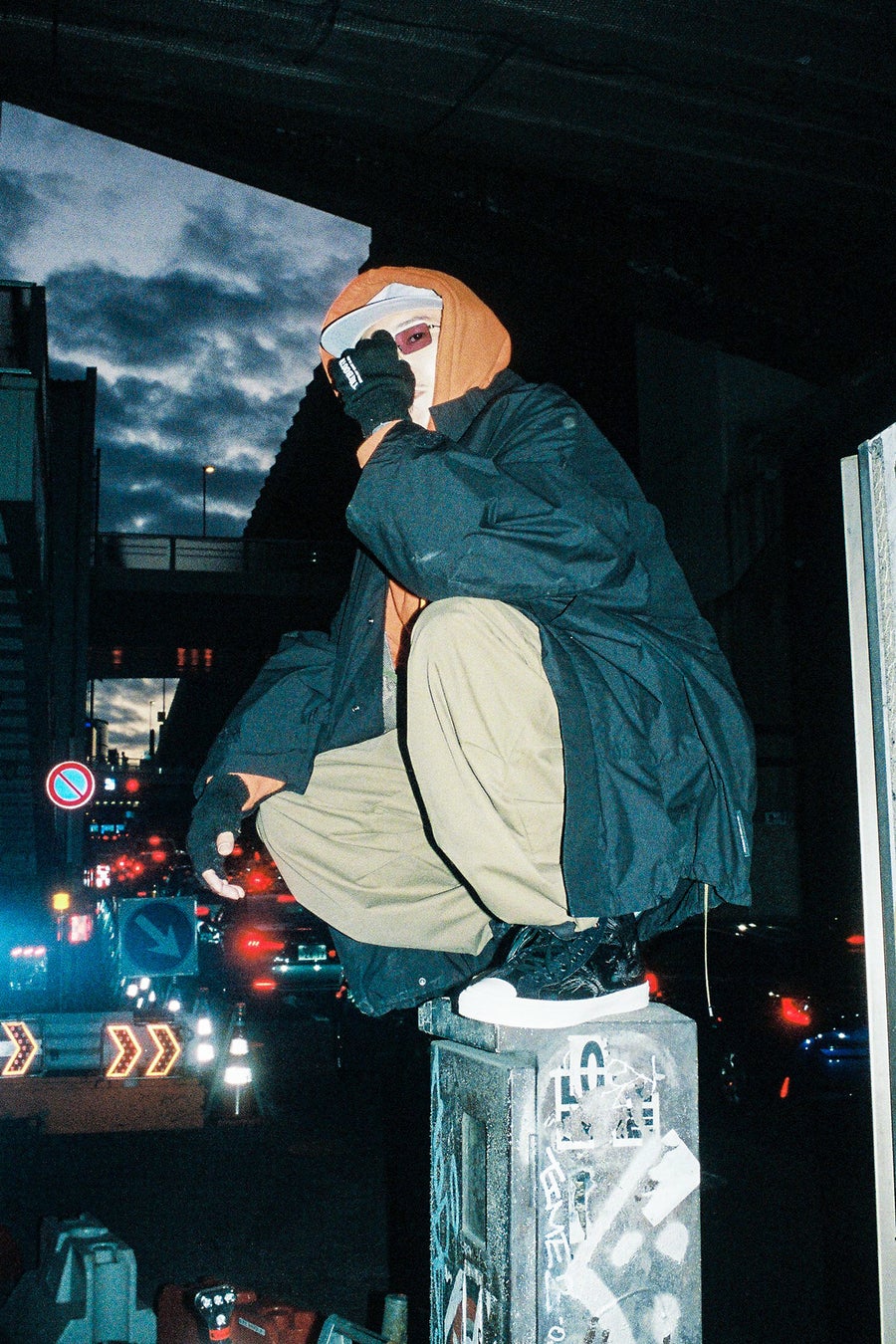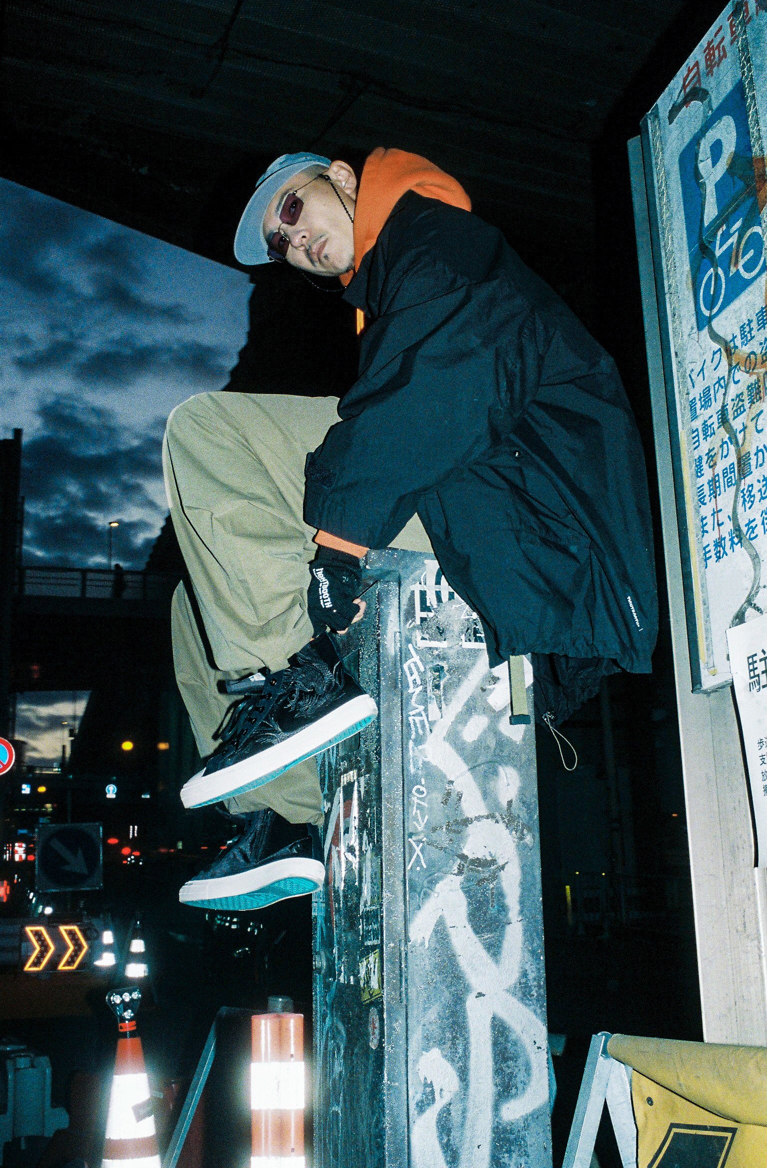 CX-PRO SK HIをベースに、メタルジッパーを内側に配し着脱性を向上。ベルベットを採用したアッパーに、上野氏の脚に入る鳳凰のタトゥーを刺繡で落とし込んだモデル。インソールとアウトソールに差したターコイズブルーもポイント。