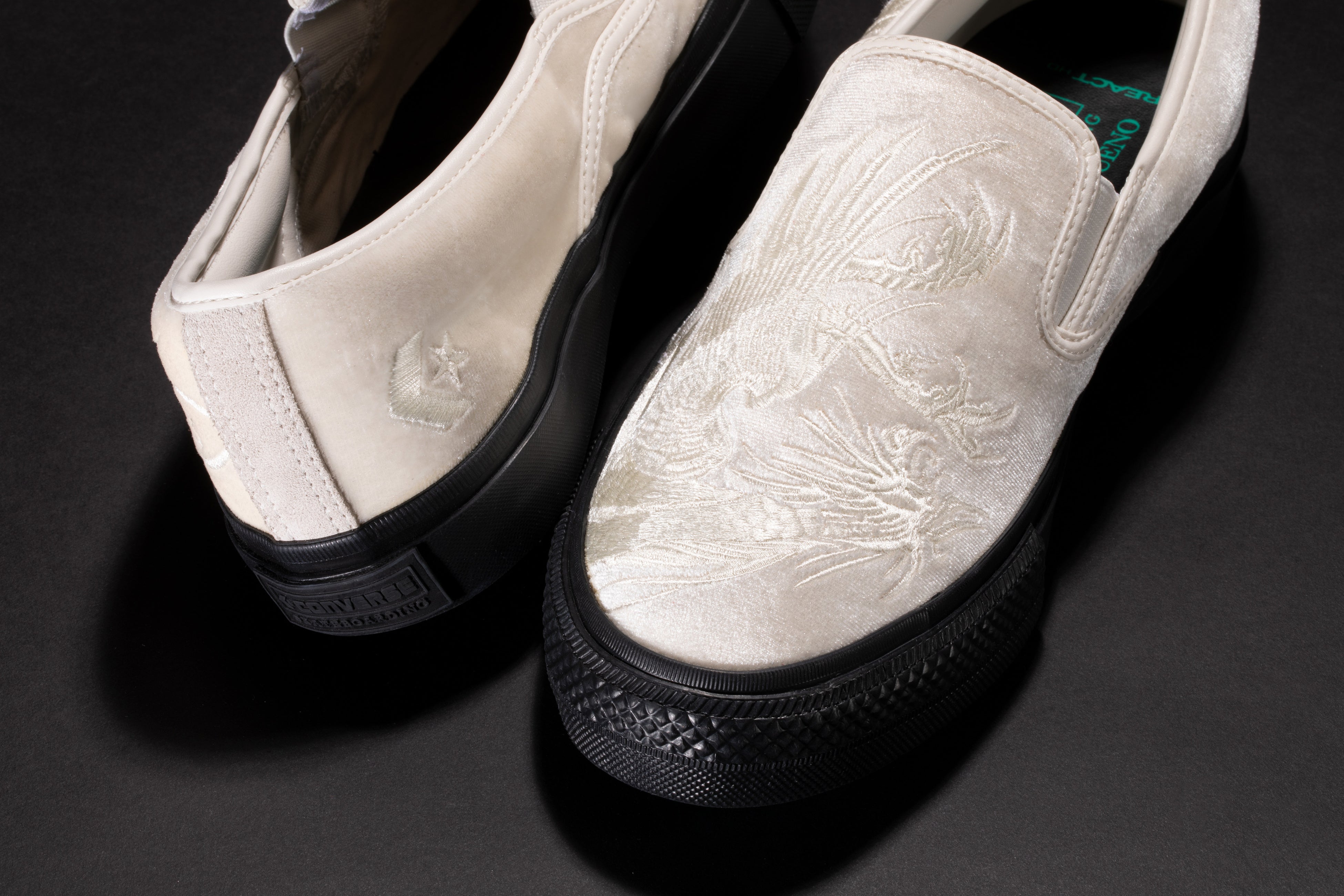 CS SLIP-ON SKをベースにベルベットを採用し、上野氏の脚に入る鳳凰のタトゥーを刺繡で落とし込んだモデル。