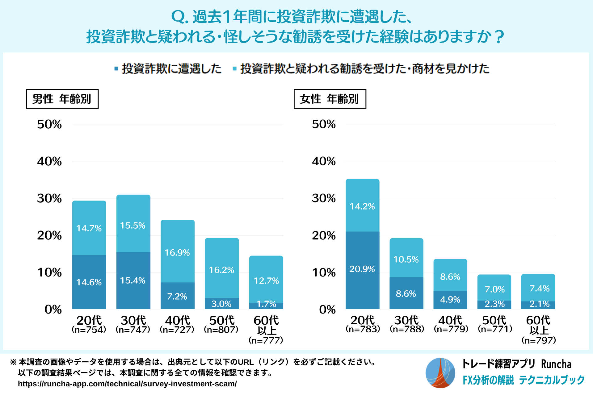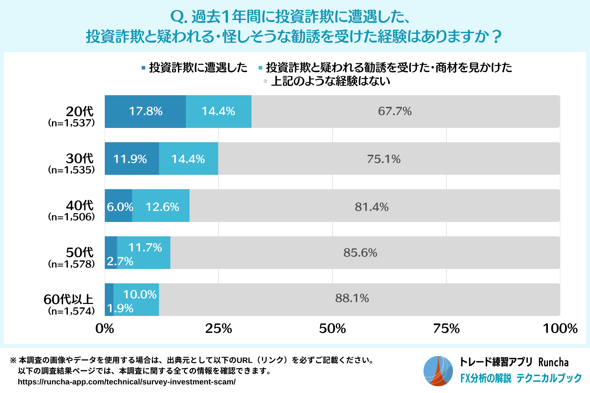 両者を合計すると20.3%となり、5人に1人が過去1年においてなんらかの投資詐欺に接触したことがあるということになります。投資に興味のない人も含めて幅広く行った調査であることを踏まえると、投資詐欺は日常生活において身近に存在するリスクといえそうです。
