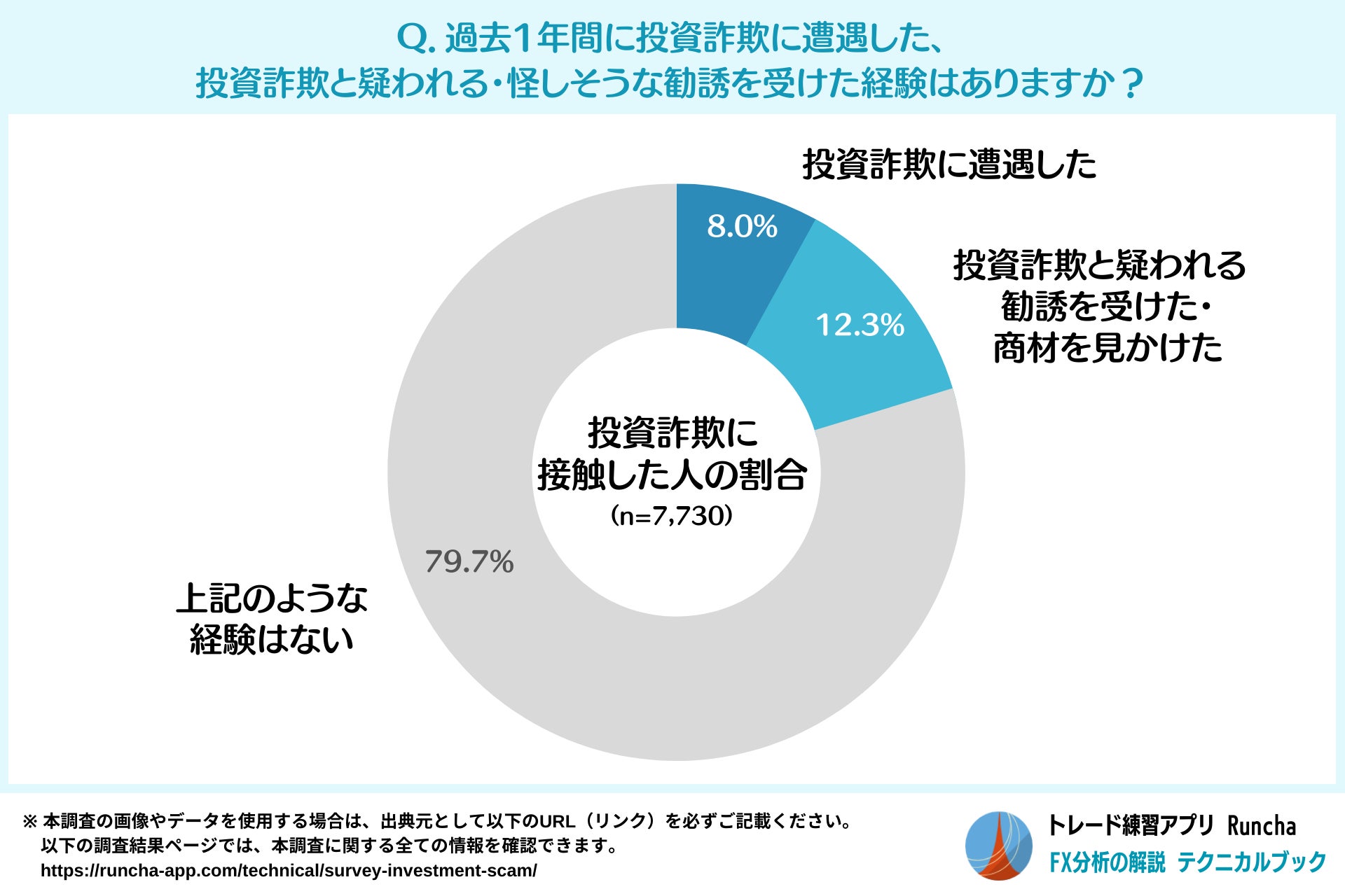 過去1年間における投資詐欺に接触した経験について質問したところ、「投資詐欺に遭遇した」と回答した人が8.0%、「投資詐欺と疑われる勧誘を受けた・商材を見かけた」と回答した人が12.3%という結果になりました。