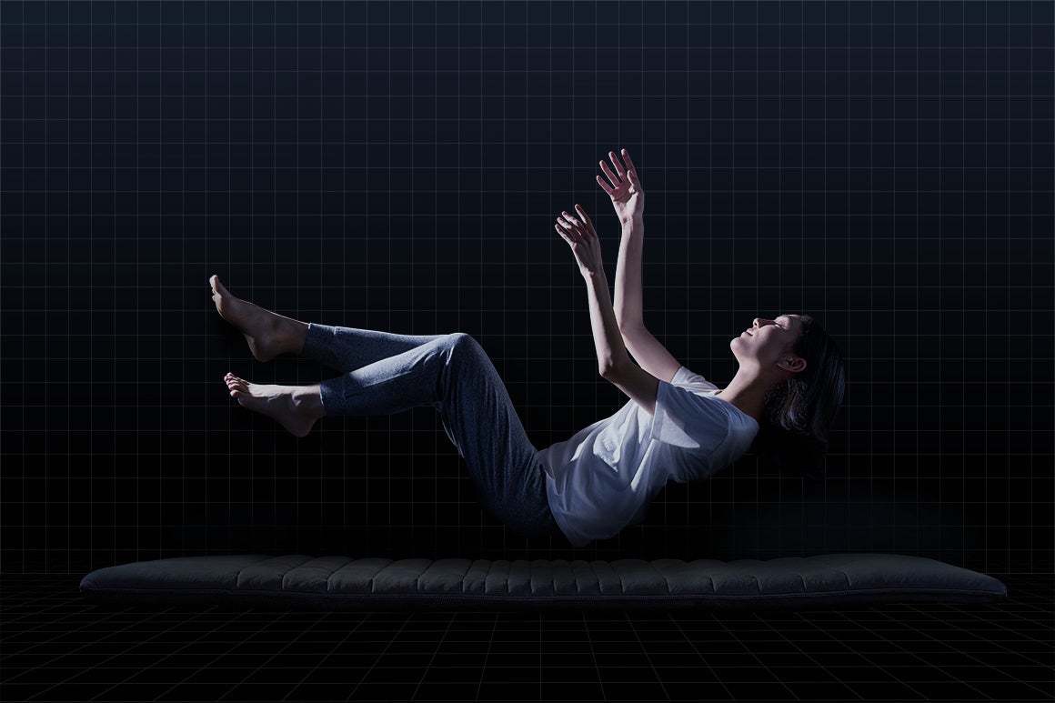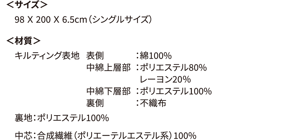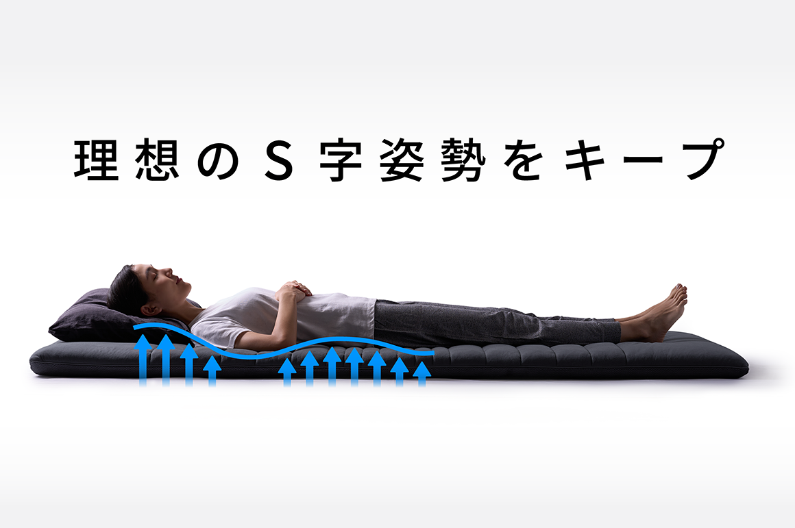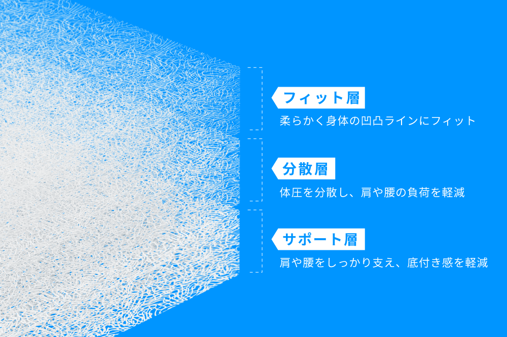 マットレスの中芯には東洋紡の体圧分散性に優れた「三次元網状繊維構造体」を採用。三次元網状繊維構造体がもつ 3レイヤー構造によって、上層は柔らかく身体を包み込むように受け止め、中間層で体圧を分散・拡散し、下層で肩や腰をしっかり支え沈み込みを防止することで、自然な睡眠姿勢に導きます。