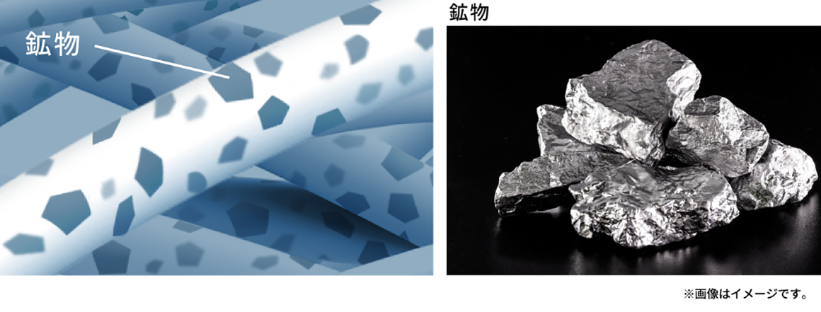 繊維1本1本にゲルマニウムを含む複数の鉱物を練り込んだ特殊繊維「RTM(Recovery Thermal Mineral)」を使用。 この特殊繊維は赤外線を輻射し温熱効果をもたらします。 繊維1本1本に練り込んでいる為、洗濯などで落ちることもございません。