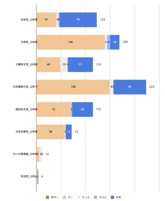 話量の多さ(特集ページにて公開)と比較すると、日本維新の会は圧倒的にフィラーが多いと言えるでしょう。また公明党は「えー」が、自民党 については「まあ」がクセになっているようです。話量と比較して、れいわ新選組は圧倒的にフィラーが少ないと言えます。