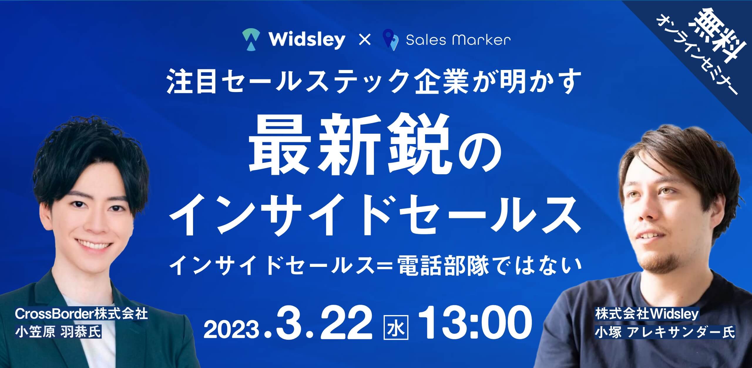 本セミナーではインテントデータ活用による営業支援ツール「Sales Marker」を提供するCrossBorder株式会社と、インサイドセールスの電話業務を効率化し成果向上を実現する「Comdesk」を提供する株式会社Widsley2社が登壇。