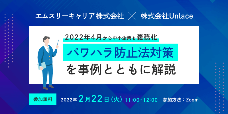 医師会員30万人以上を有するエムスリーグループで医療人材ビジネスを展開するエムスリーキャリア株式会社(本社:東京都港区、代表取締役:沼倉敏樹)は、株式会社Unlace(本社:東京都渋谷区、代表取締役:前田康太)と2022年2月22日に「パワハラ防止法対策」をテーマにした参加費無料のオンラインセミナーを共催いたします。
