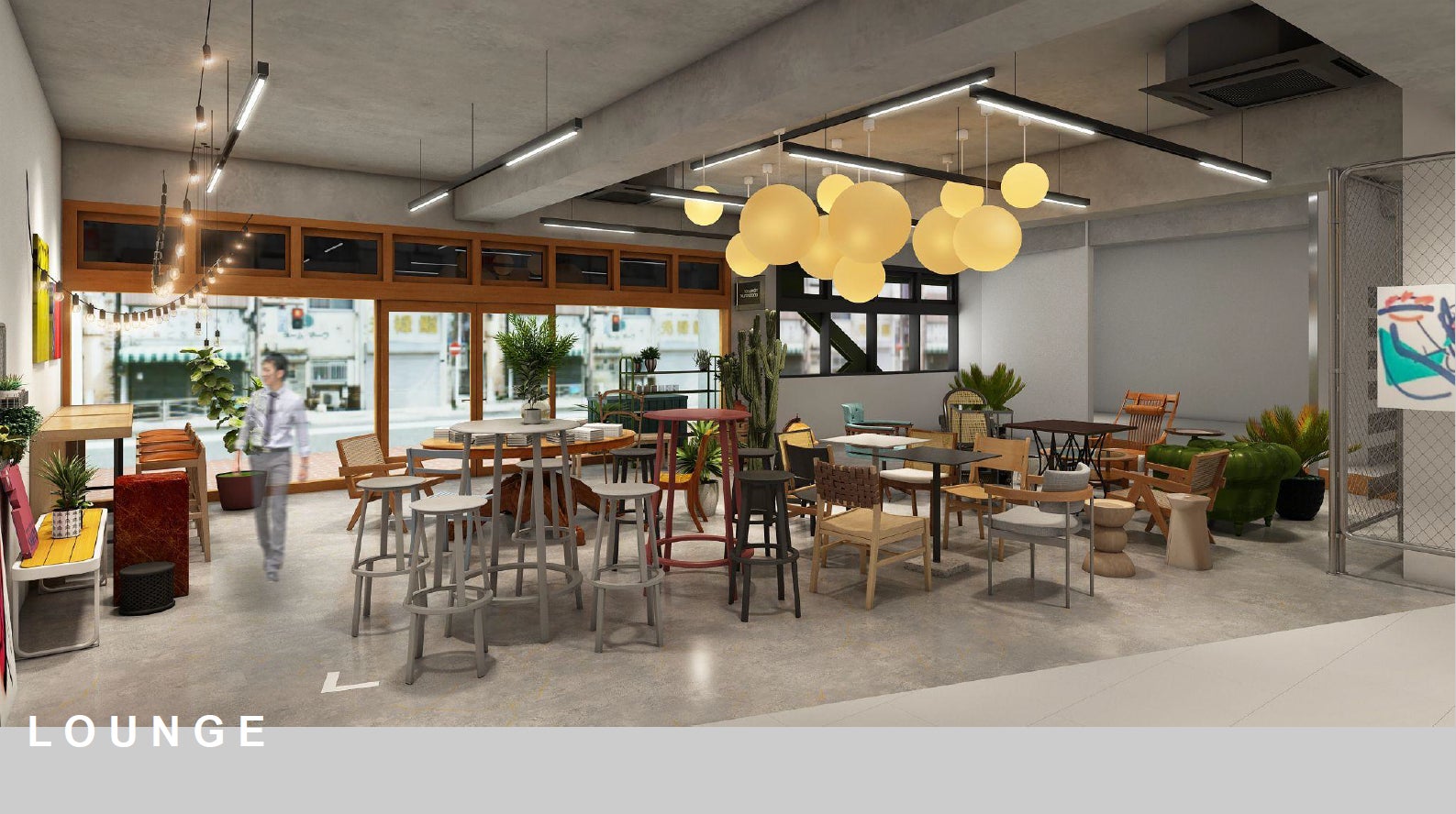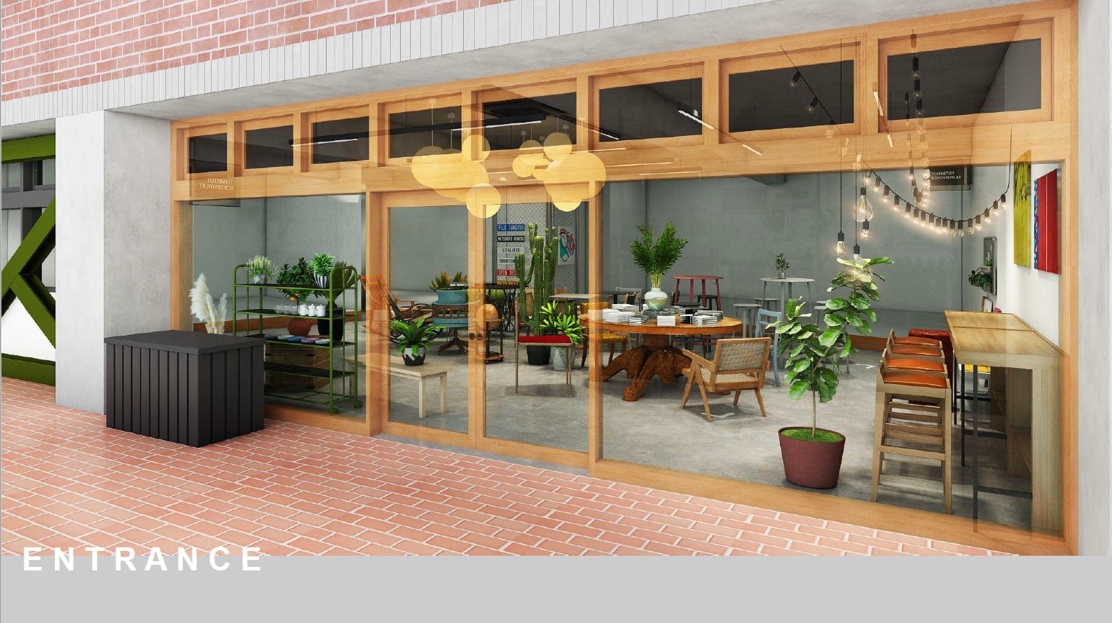 ②建物の無骨さとテナント区画・調度品の柔らかさが調和した空間