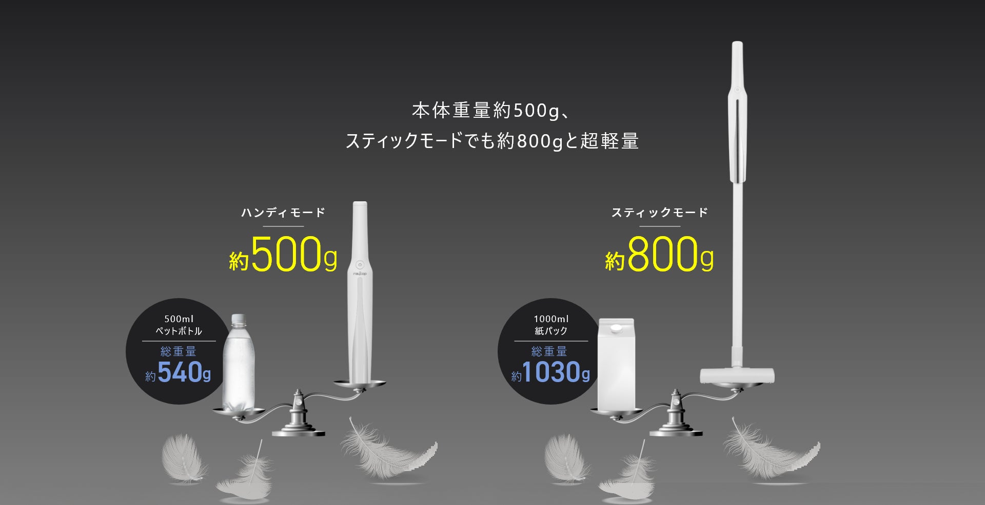 特長1:本体重量約500g、スティックモードでも約800gと超軽量