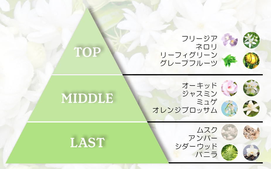 爽やかなフリージアやネロリの澄んだ香りをトップに、オーキッド、ミュゲ、ジャスミンのみずみずしく透明感のある白い花々の香りが重なり、ラストは繊細なムスクとアンバーが柔らかく溶け込みます。