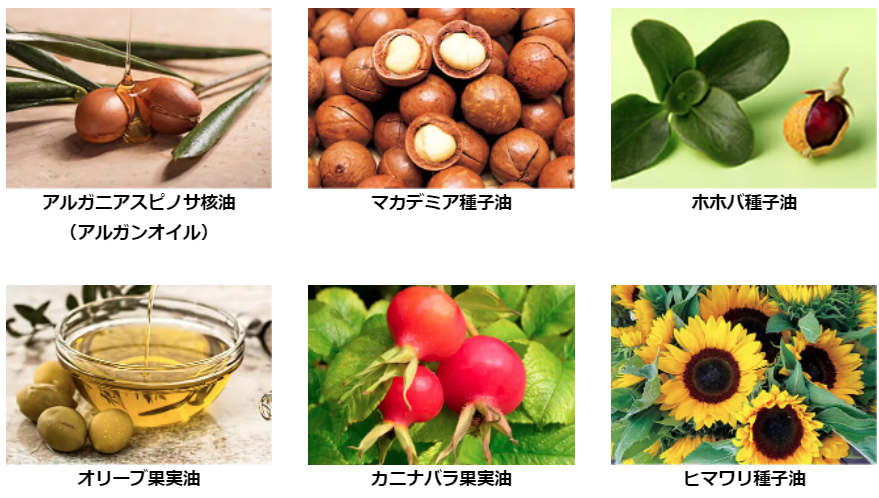 ※6 アルガニアスピノサ核油(アルガンオイル)、マカデミア種子油、ホホバ種子油、オリーブ果実油、カニナバラ果油 ヒマワリ種子油