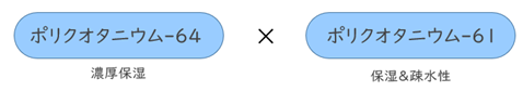 ヒアルロン酸の約2倍の保湿力がある言われるポリオクタニウム‐64と毛髪表面を疎水性に傾けるポリオクタニウム‐61のダブル配合で、髪の内側をうるおいで満たし、外側はうるおいヴェールで包み込みます。