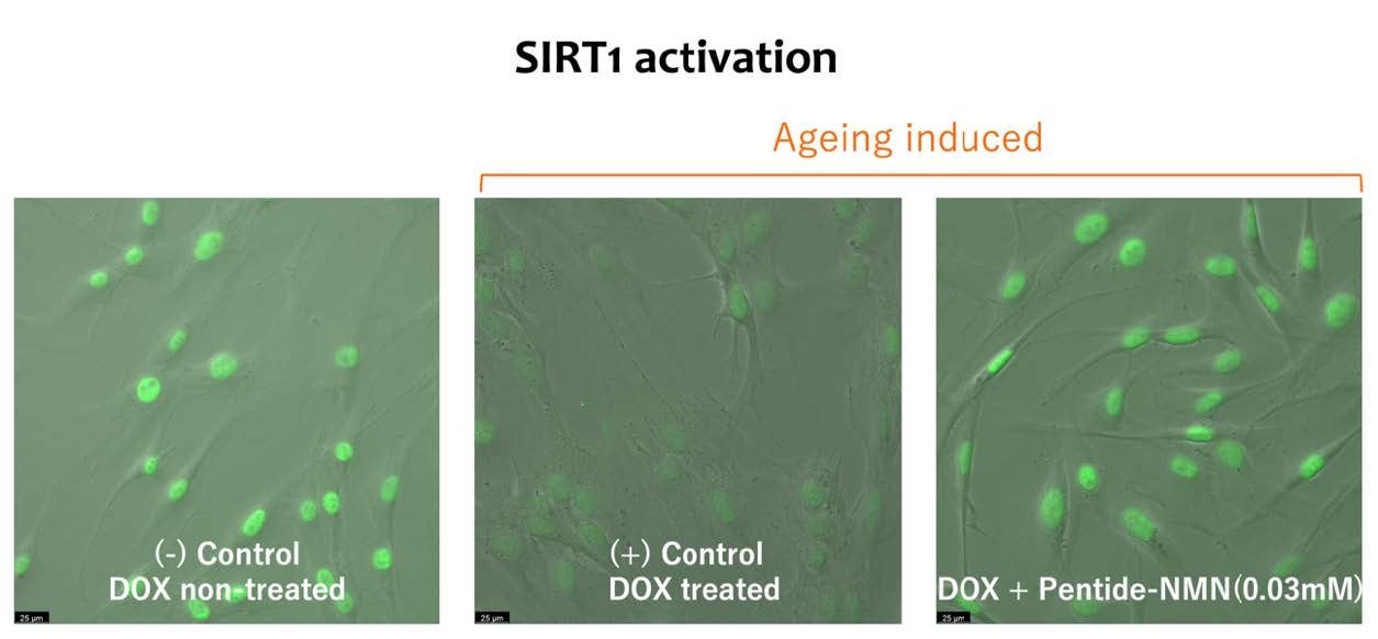 NMN はアンチエイジング・サプリメントとして、多くの製品が流通しており、日本でも著名人が使用していることで、大変注目を集めている。一方でNMN を化粧品に配合した際には、いくつかの欠点がある。経皮吸収性、安定性、細胞への取り込みがそれぞれ悪いということだ。浸透型NMN 誘導体『Pentide-NMN』はそれらを克服していることが、細胞実験によって検証されており、実験結果では、細胞中のNAD+を増加させ、アンチエイジング遺伝子として知られているサーチュイン遺伝子を発現させていることが確認されている。