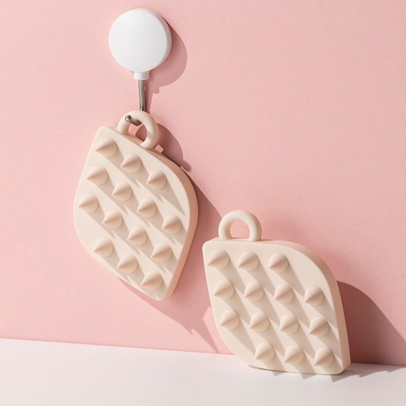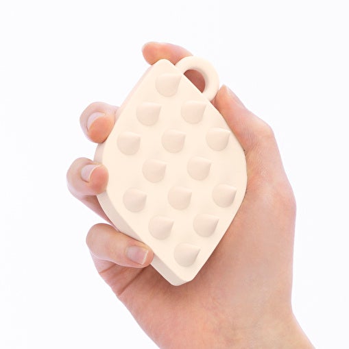 女性の手のひらのサイズに合わせて大きさを設定。カーブの形状が親指にフィットし、握りやすく、力が入りやすい。また、自立性がありフックがあることで衛生的に保管も可能です。