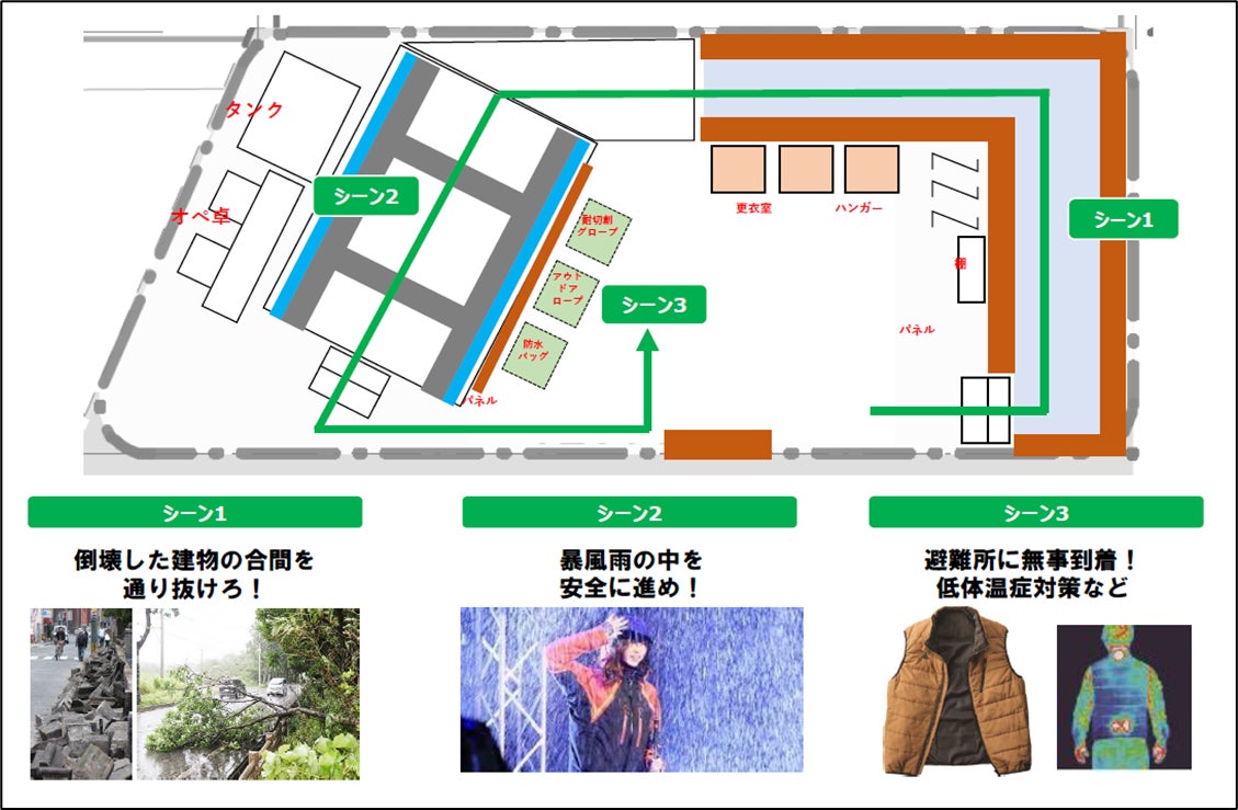 ・災害時に起こる屋外の予期せぬ環境下を再現し、避難時にワークマンの製品がどのように役に立つかを実際に体験できます