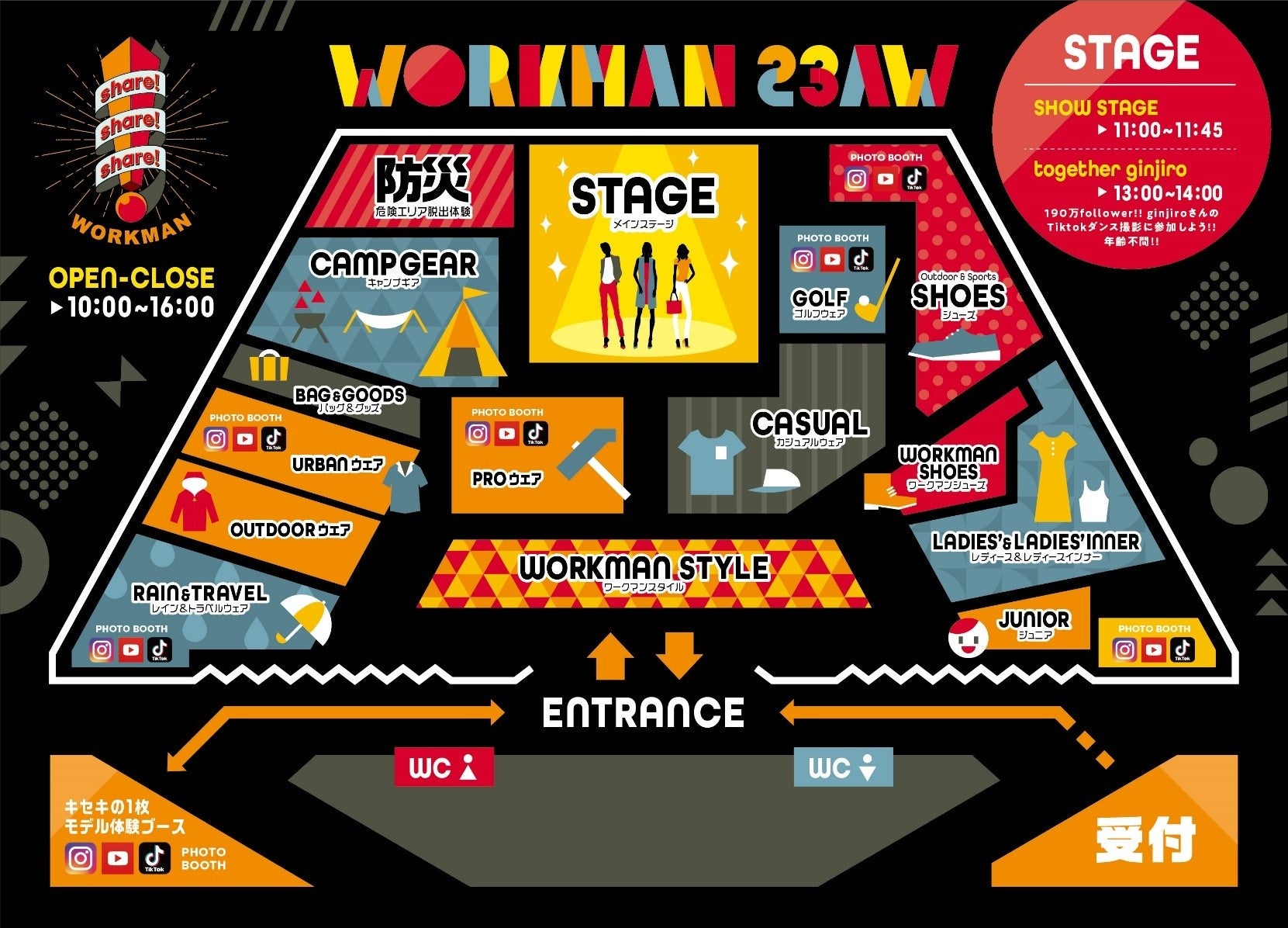 ・会場入口付近に「share,share,share,~価値観の共有・共感~」、「WORKMAN-ship~没個性からの脱却~」、「life is~トレンドスタイリング~」、「tough~ポジティブタクティカルウェア~」をテーマにしたマネキンの陳列