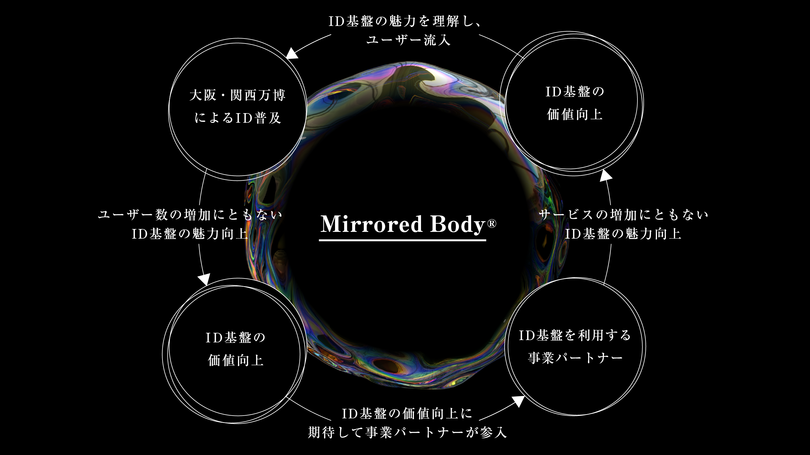 パビリオンでの実証後、Mirrored Body®は本人の意思で管理できるデジタルIDとして機能します。これを新しい活動単位・身体としてフィジカル世界とデジタル世界を自由に往来することにより、人が体験できる時間や空間が拡がり、人生の可能性も大きく拡げることになります。