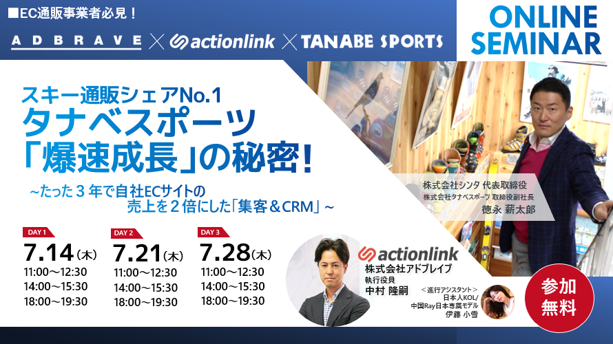 株式会社アドブレイブ(本社:東京都千代田区 代表取締役 山本 篤廣)が運営・販売するEC特化型CRMシステム「アクションリンク」は、2022年7月14日(木)〜全3日程に分けてスキー通販シェアNo.1の株式会社タナベスポーツとの対談形式で「タナベスポーツ『爆速成長』の秘密」と題したオンライン対談セミナーを開催いたします。