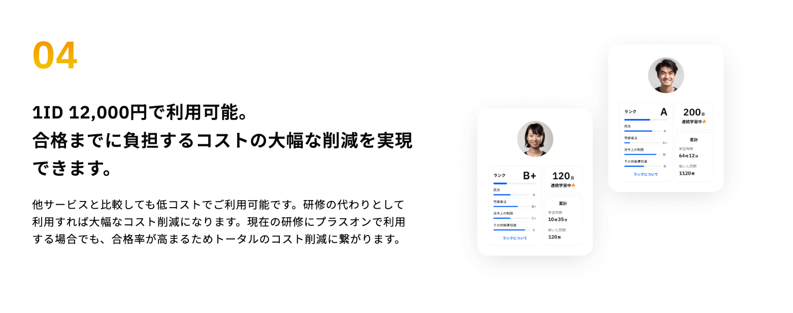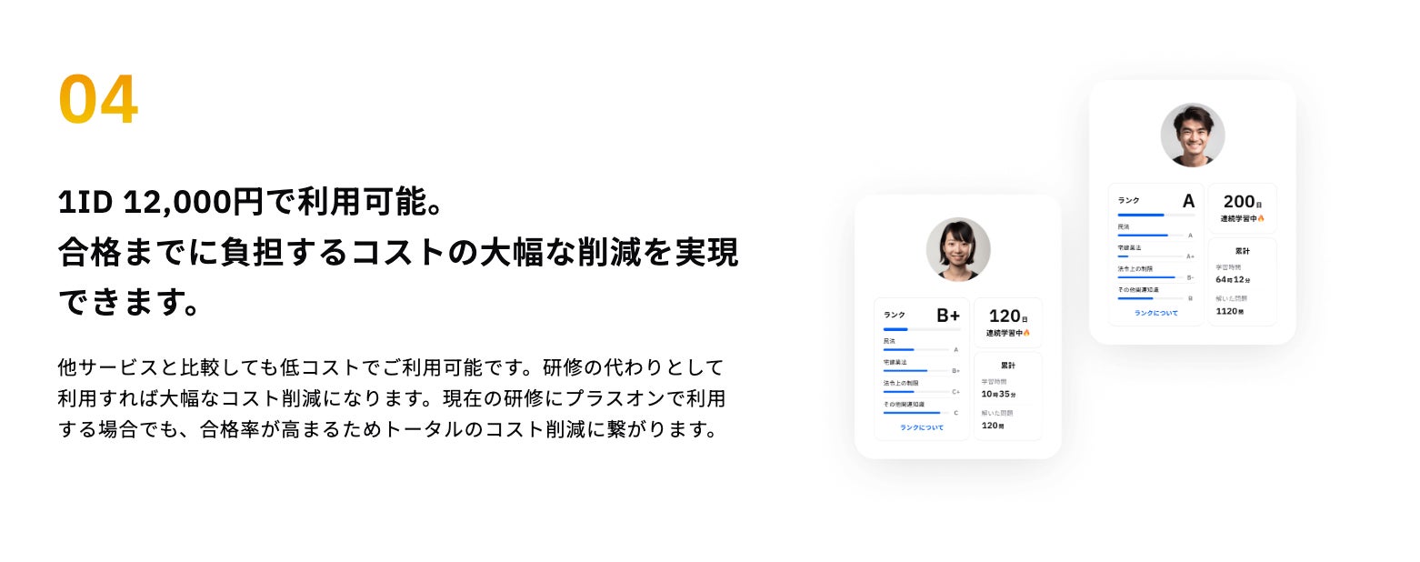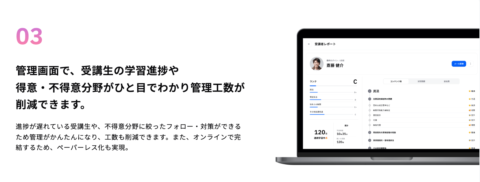 このサービスの特徴は何と言っても①スキマ時間を活用して、どこでも学習が出来るということに加え、②会社事として、人事部が内定者や社員の学習進捗状況を管理・チェック出来、進捗が遅れている・理解度が高まっていない社員に対し、個別に寄り添ったサポートが出来ることにあると思います。私も5年前に宅建士を取得しましたが、このようなソフトがあればもっと効率的に合格できたのではないかと思っています。