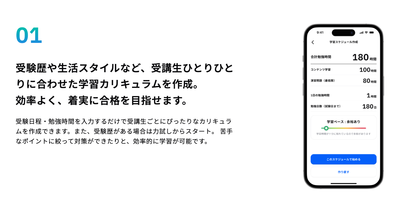 「Workschool宅建」は各個人が業務と並行しながら資格勉強を進めるための個人学習スケジュールを自動作成することができます。管理者が社員や内定者の学習進捗を一覧でき、 進捗やテスト結果に応じて学習リマインドをすることも可能です。