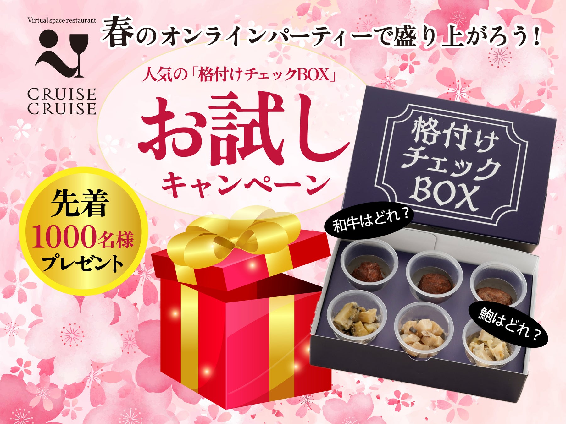 首都圏で6店舗レストラン展開をしている㈱ムーンエレファントジャパン(本社:東京都豊島区東池袋3-1サンシャイン60 58階 代表取締役会⻑:南 有⼦)は、オンライン宴会が可能な「バーチャル空間レストランCRUISECRUISE」で、先着1000名様に「格付けチェックBOX」がお試しいただけるプレゼントキャンペーンを3月9日(水)からスタートいたします。