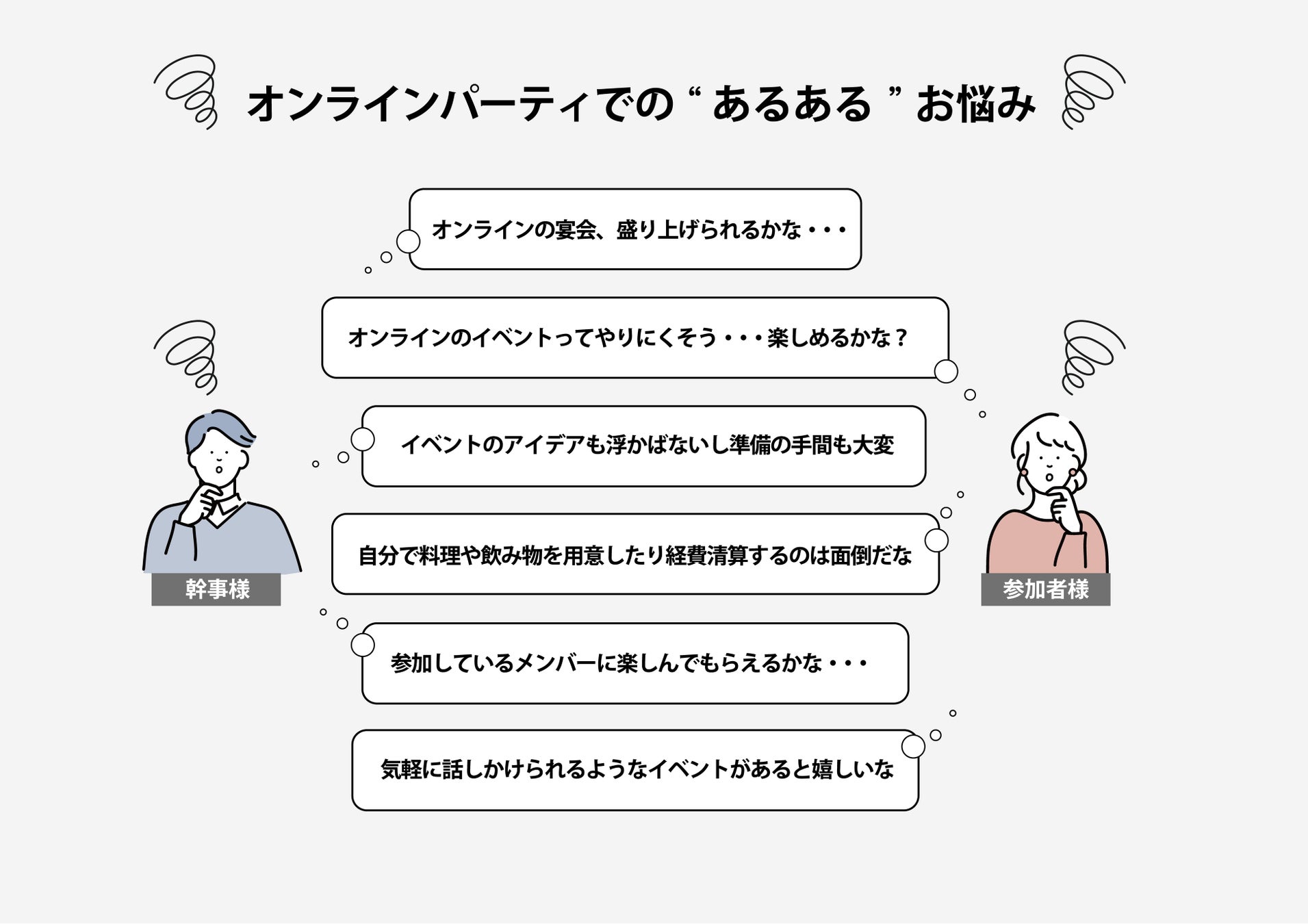 オンライン会食・飲み会開催時に皆様が抱えている悩み、「どのようなことをオンライン会食で行なえば、より親睦が図れるのか?」。