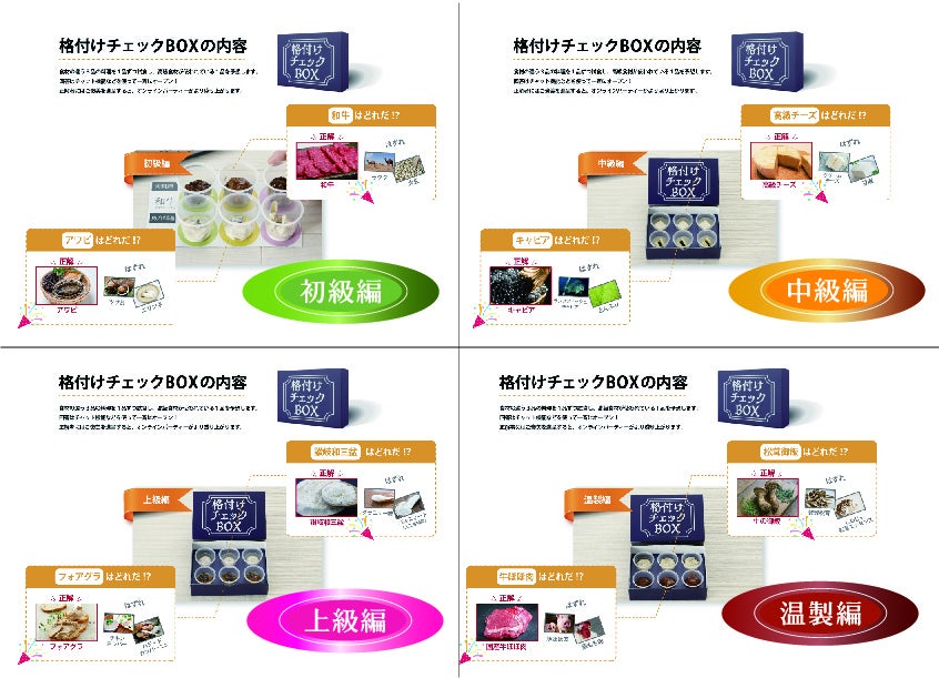 ■格付けチェックBOXは、①初級編(和牛と鮑はどれ?)②中級編(高級チーズとキャビアはどれ?)上級編(和三盆糖とフォアグラはどれ?)温製編(松茸と牛ほほ肉はどれ?)と4つのラインナップをご用意しております。