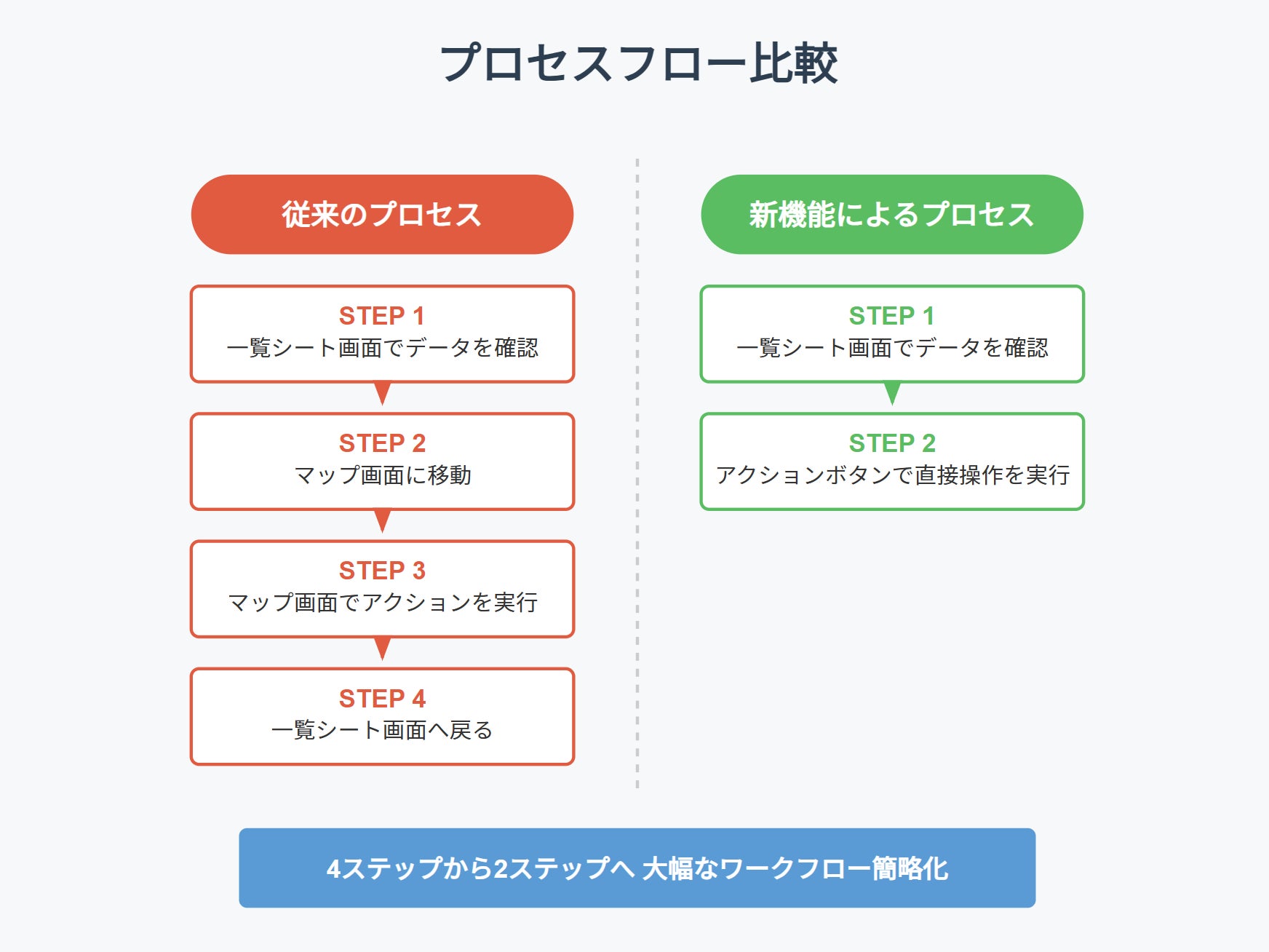 新機能「アクションボタン機能」は、ZENPORTのカスタマイズ可能な表画面「ZenGrid」画面上で直接動作し、マップ画面に切り替えることなく主要な操作を実行することを可能にします。