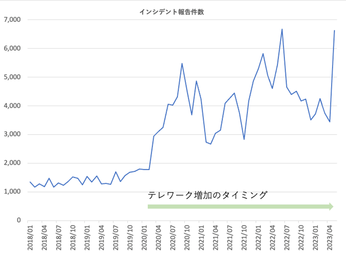 2020年の3月以降、テレワークが増加したと思われる時期からインシデント報告件数が急増しています。このことからも従来型の境界型セキュリティからゼロトラストセキュリティへ移行を進めていく必要があると考えています。