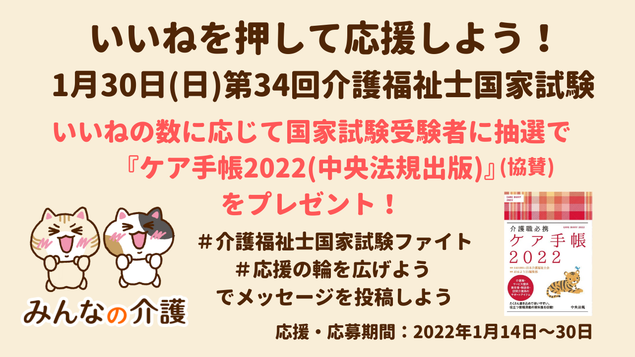 「みんなの介護」は、第34回介護福祉士国家試験の受験者にエールを送るために#応援の輪を広げよう キャンペーンを2022年1月14日(金)から1月30日(日)まで開催いたします。