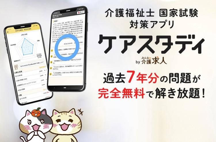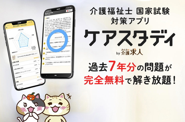 みんなの介護では、介護福祉士国家試験対策に役立つ「ケアスタディ」を2020年にアプリとwebサービスの両方でリリースしました。 完全無料・全問解説付きで介護福祉士を目指す皆様の合格を強くサポートします。スマホでもご利用いただけますので、通勤や通学のスキマ時間の学習にもおすすめです。