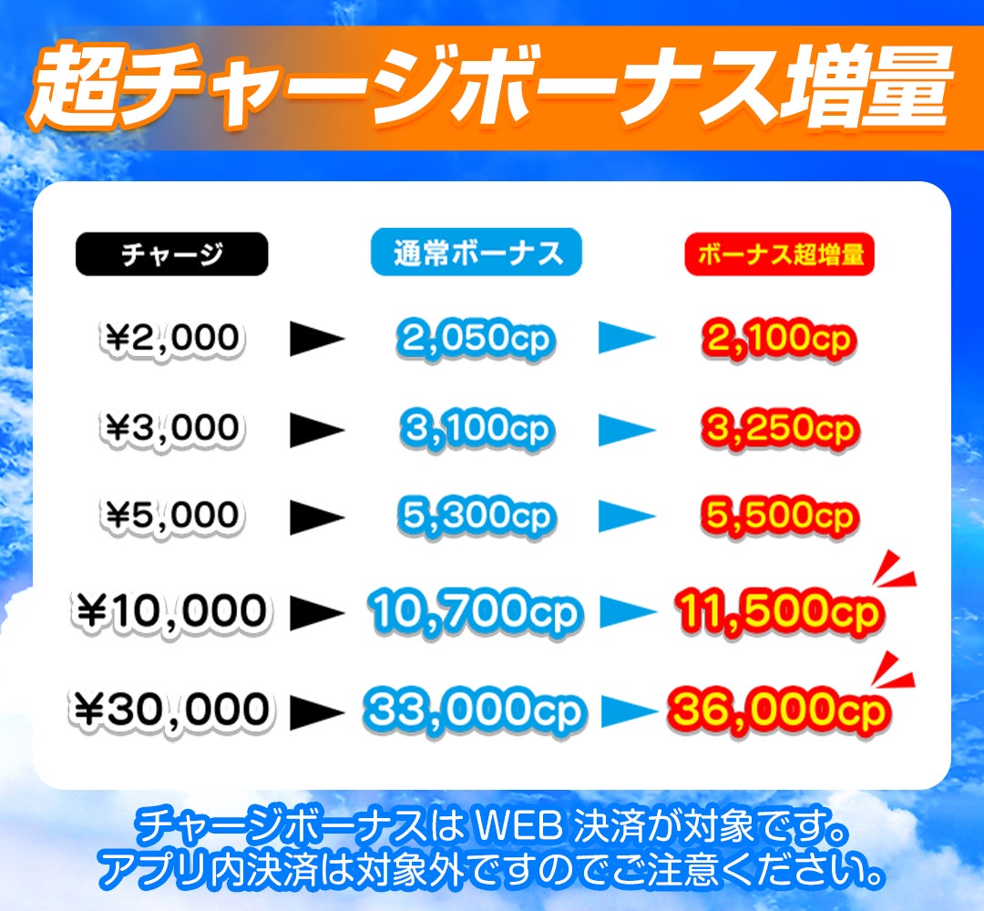 ※チャージボーナスはWEB決済が対象です。アプリ内決済(App Store決済/Google決済)は対象外になりますのでご注意ください。