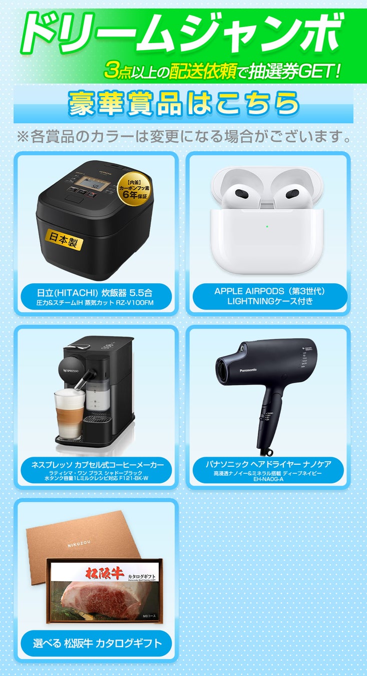 1度の配送で3点以上の景品依頼で抽選券がもらえるドリームジャンボ、獲得動画とハッシュタグ投稿で豪華賞品が当たるキャンペーンの2つ開催いたします。