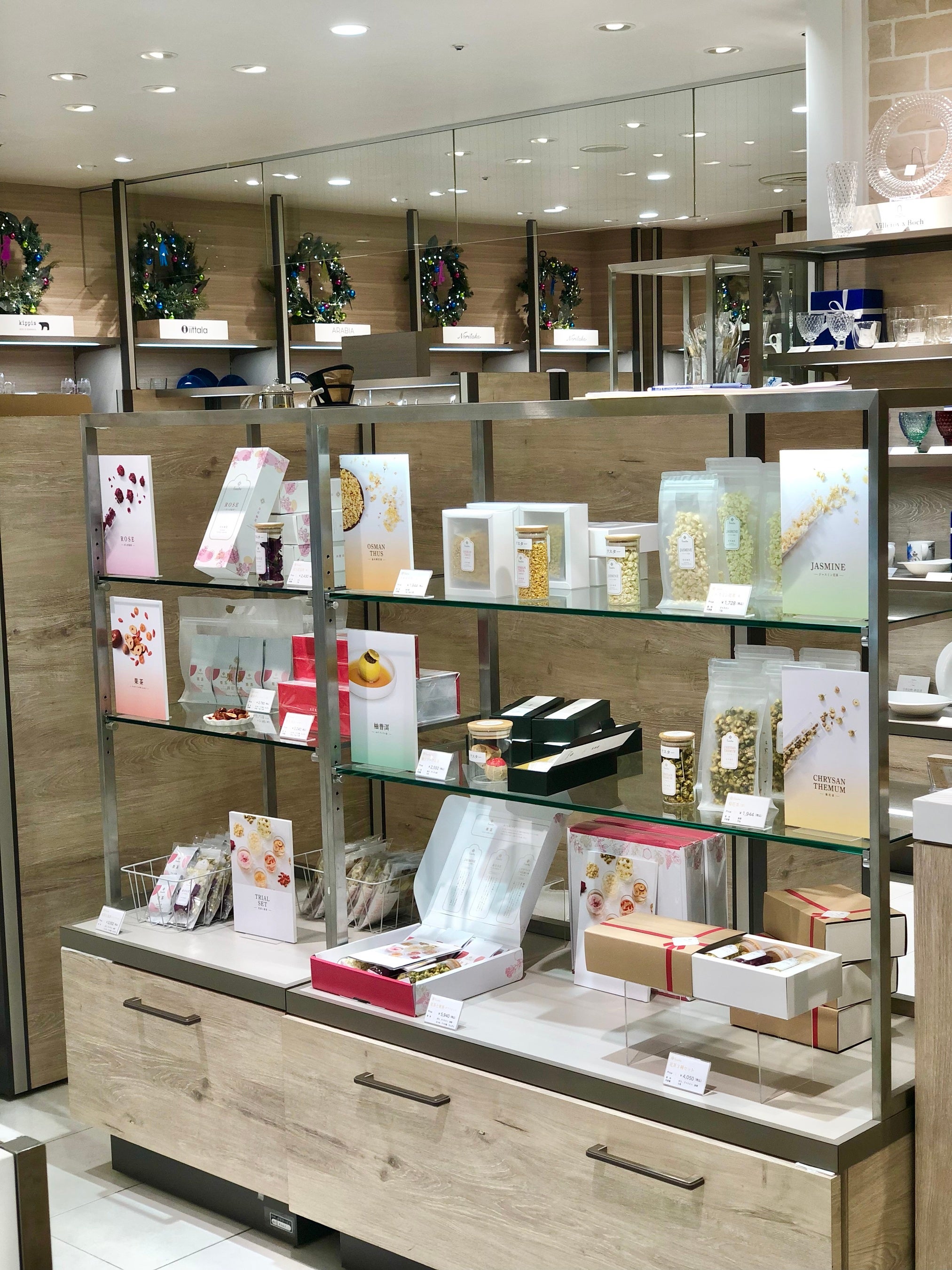 大丸神戸店に連続4年ポップアップ出店。花茶と果茶を取り揃えています。一番人気のばら花冠茶®と果茶のギフトパッケージもご用意しています。試飲して好みの花茶果茶を見つけてください。