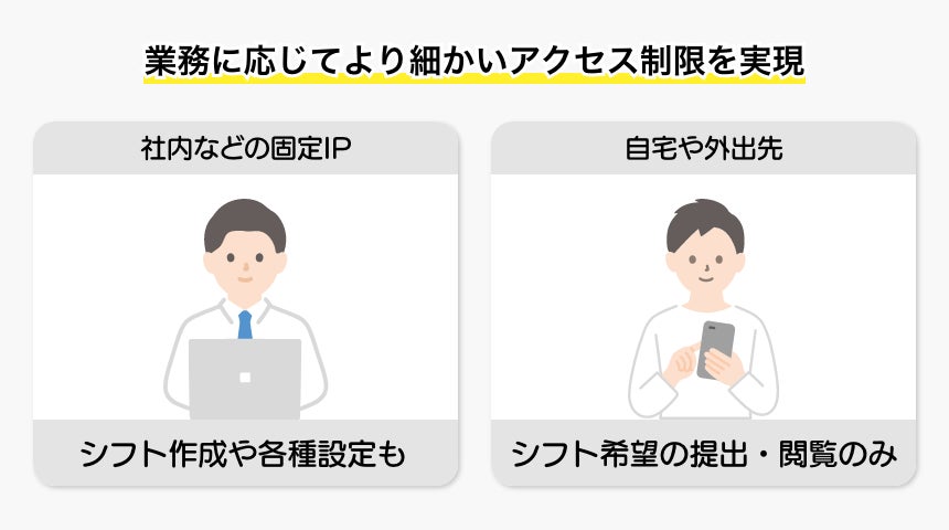 社内などの固定IPからのアクセスのみシフト作成業務・各種設定を許可し、自宅や外出先からのアクセスはシフト希望の提出・閲覧のみに制限します。