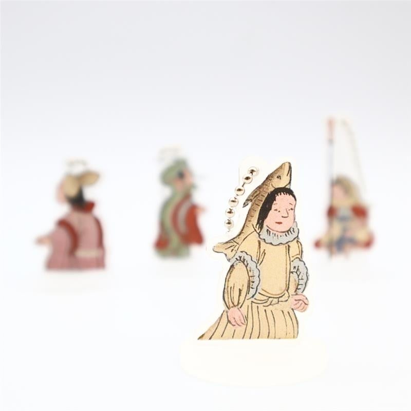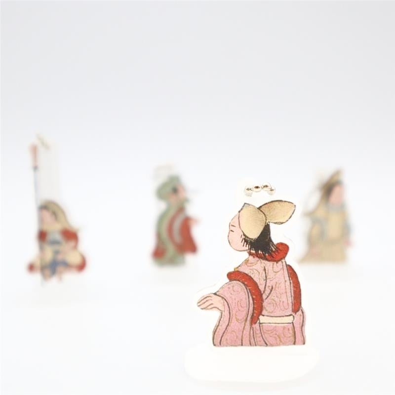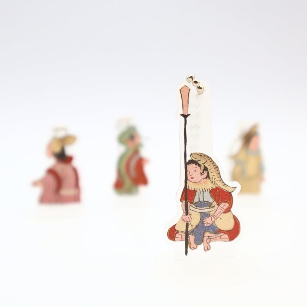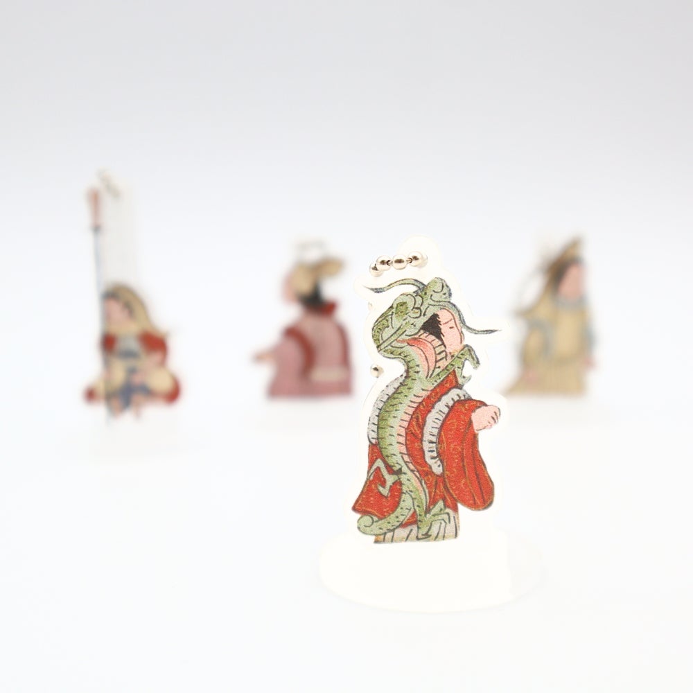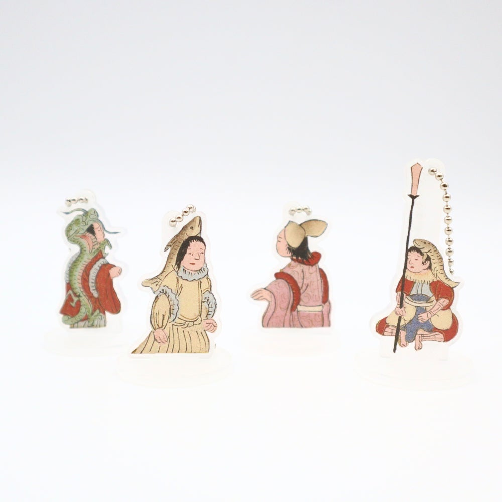 詞書と挿絵で構成される絵本「大織冠」は、藤原鎌足と竜王の宝珠をめぐる争奪戦の物語です。挿絵に登場する八大竜王たちを、ミニサイズで持ち歩けるボールチェーン付きミニアクリルスタンドにしました。4種の中から1種が当たるシークレット形式で販売します。
