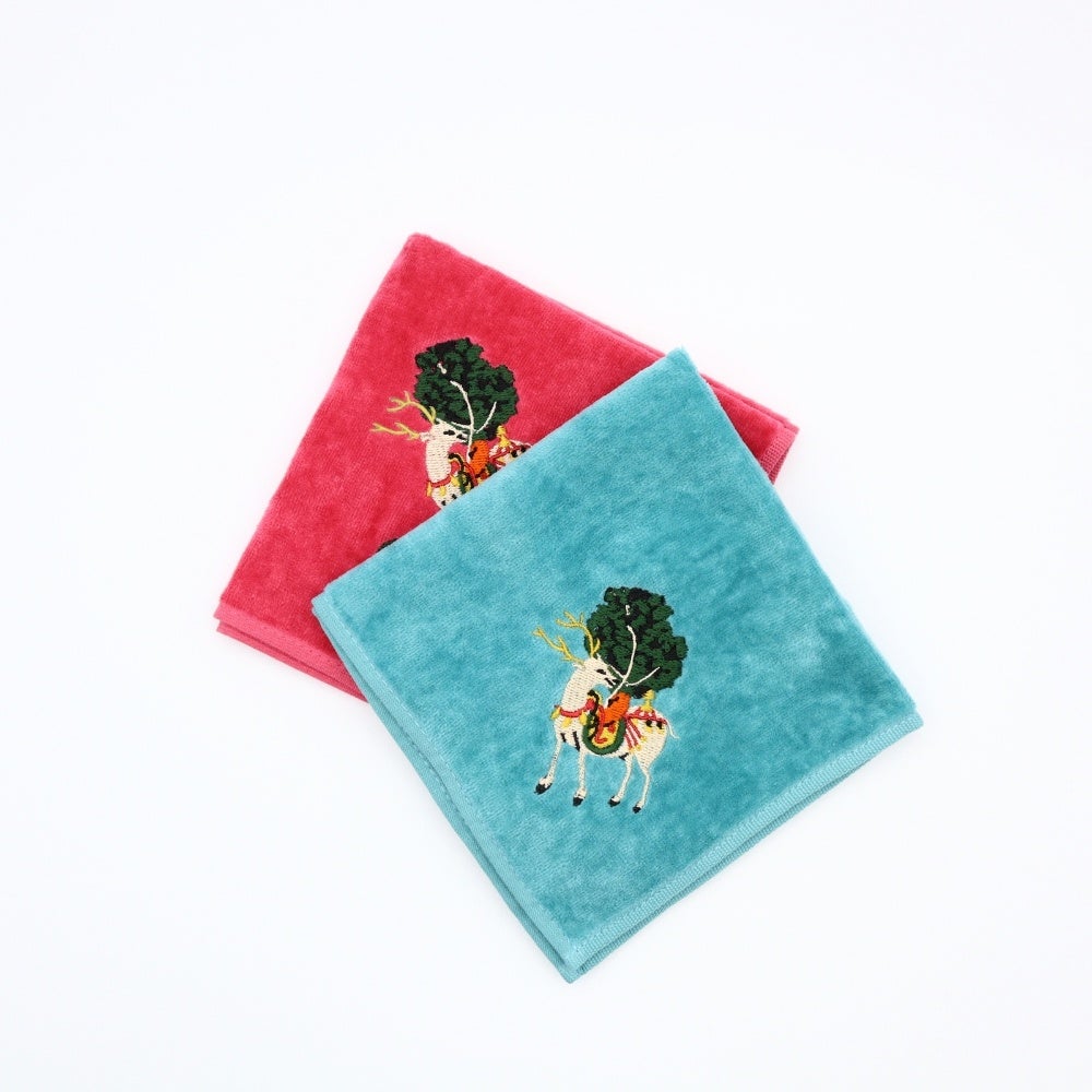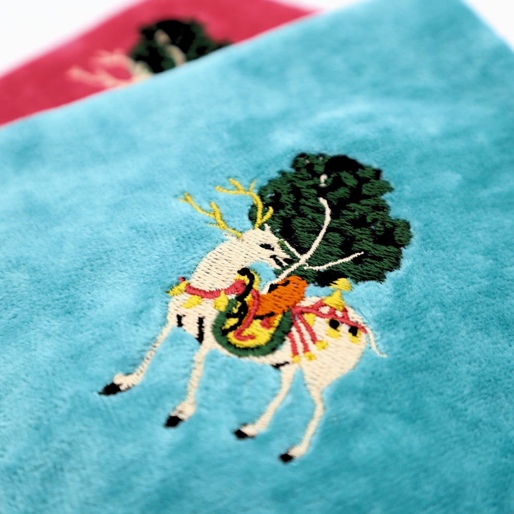 日本製タオルのブランド「Hotman」とのコラボレーションで、ワインとブルーグリーンのベロアハンカチに、「春日宮曼荼羅」に描かれた鹿の姿を6色で刺繍しました。