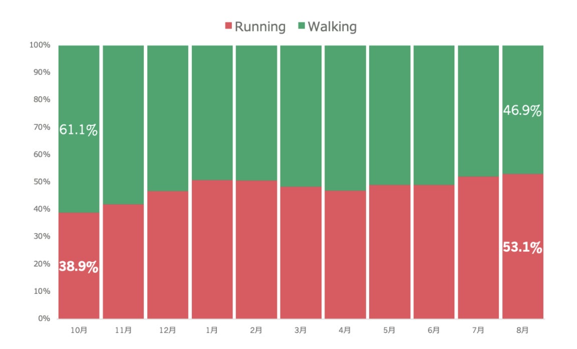 - 徐々にウォーキングからランニングの割合が増え、参加者の行動変容に寄与しております。
