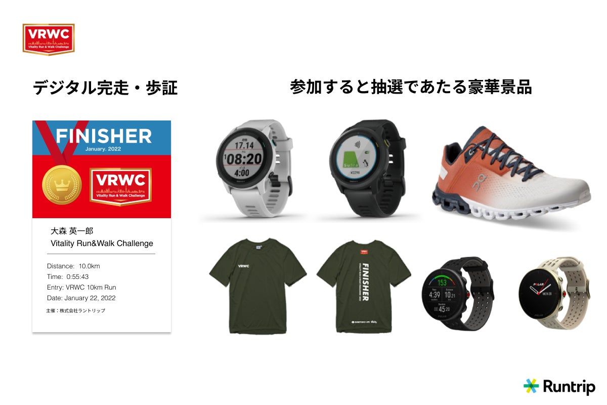 本イベントは、各種スマートフォンアプリやウェアラブルデバイスでGPSにより記録したデータを完走・完歩後にアップロードすると、オリジナルのデジタル完走証・完歩証が発行されます。また、抽選でランニングシューズやウォッチなど健康的な生活を後押しするアイテムが当たるチャンスがあります。