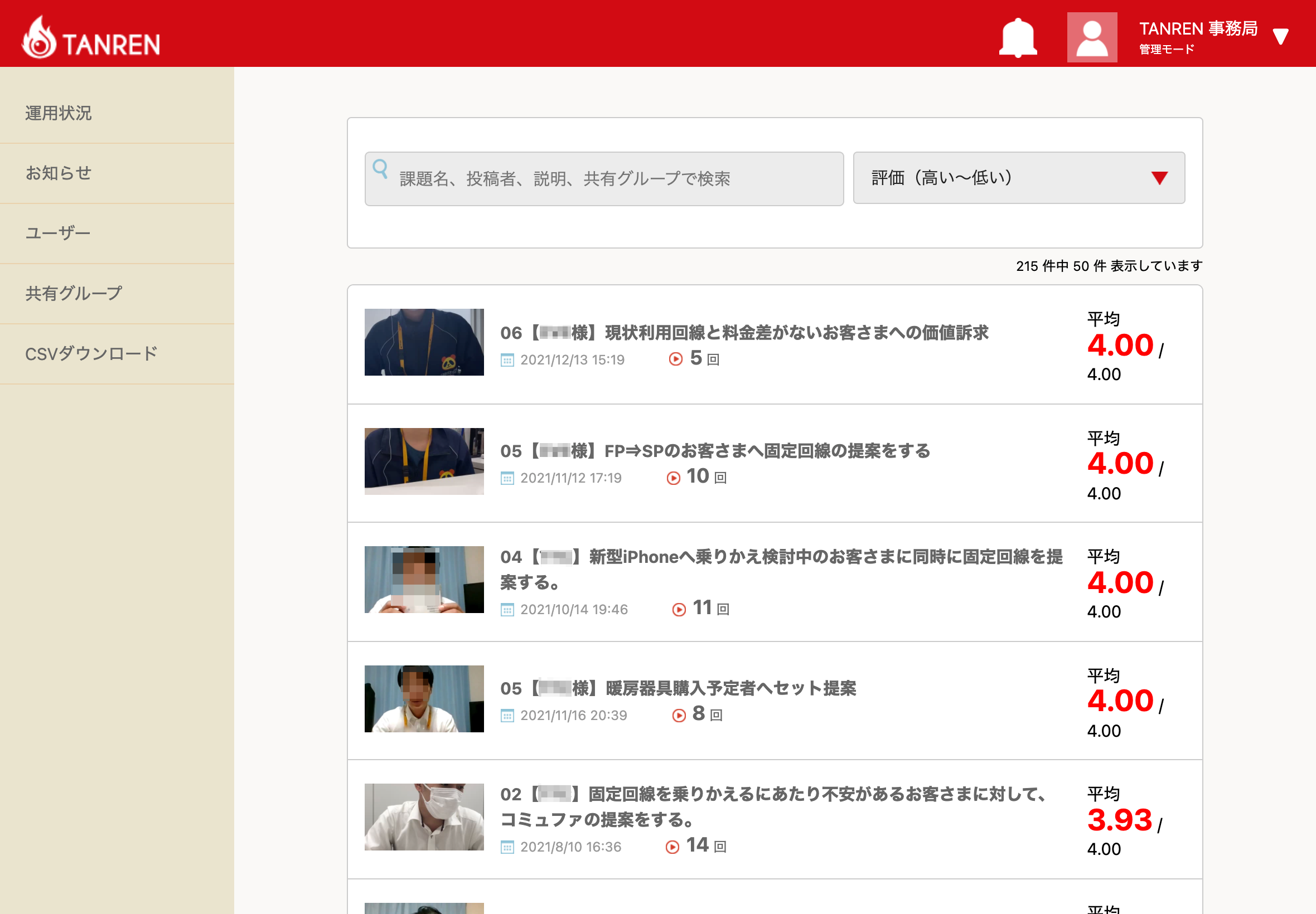 それら機能によって、代理店ごとのセールスノウハウ流出を未然に防ぎ、また成績上位者の営業トークの可視化・分析によって該当代理店の営業力底上げになるような初期設計をTANREN株式会社にて実施しました。