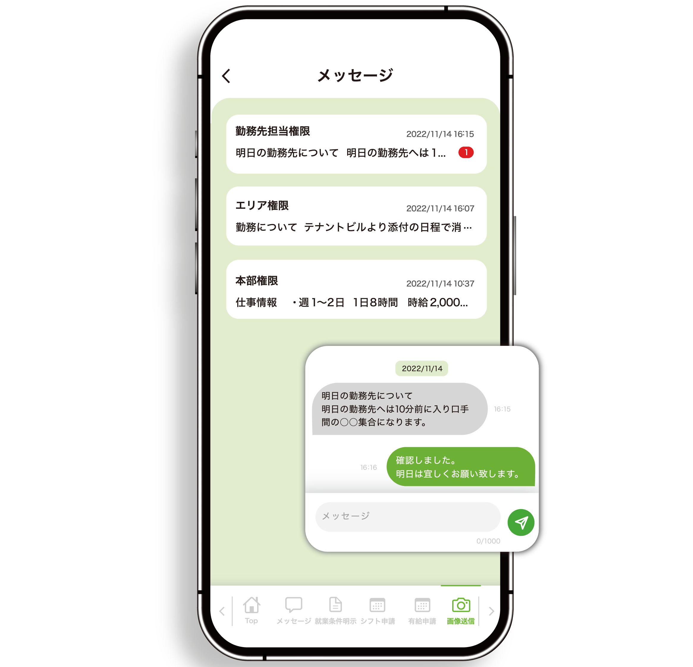今回のリリースでは、完全永久無料となる新プラン「無料プラン」を新たに用意し、導入企業は専用の管理画面からの操作のみで、オリジナルのスタッフマイページをスマホアプリで構築できます。また、スタッフとのチャットメッセージ機能(月間500通まで)や、タイムシートなどの紙書類を画像で提出できる機能(累計500画像まで)が無料で使えます。また、アップグレードすることで、希望シフト回収機能やweb給与明細書、web雇用契約書などの機能も利用できるようになります。