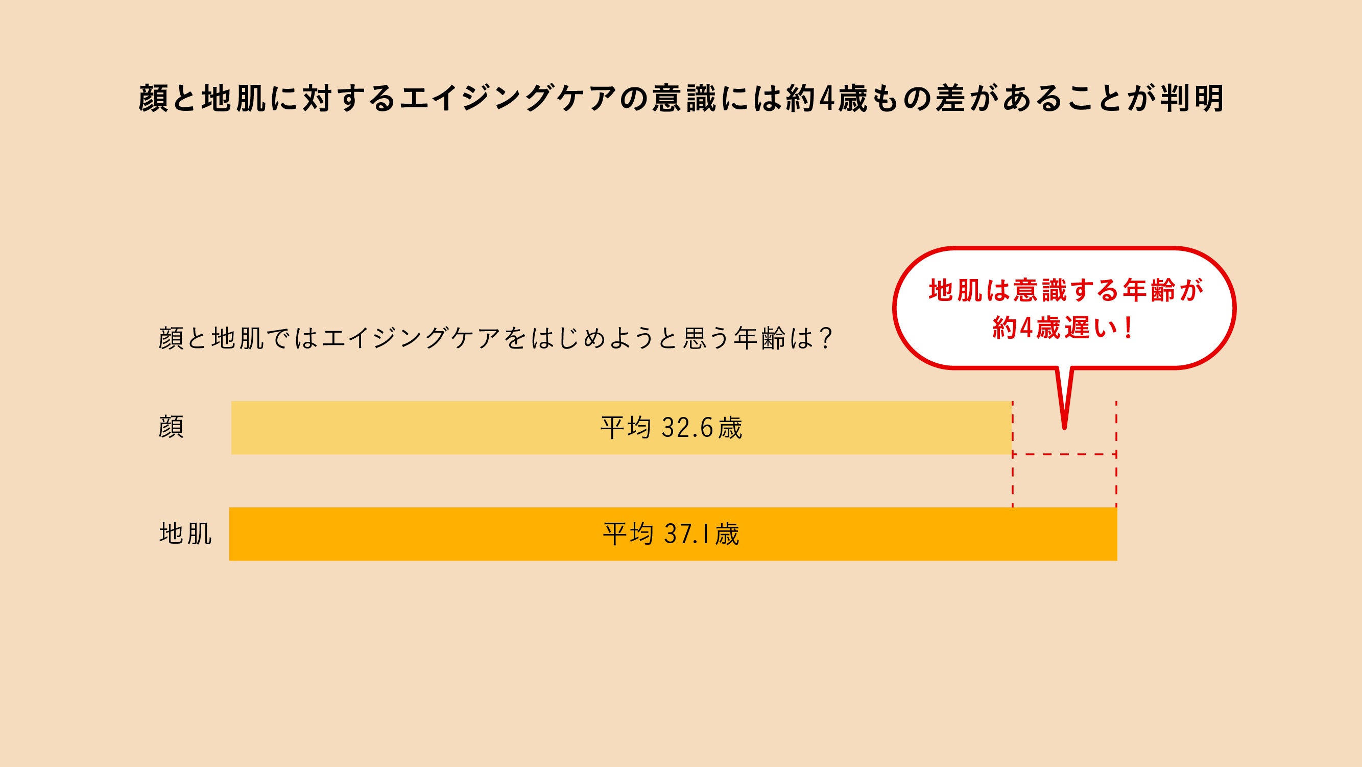 顔と地肌の皮膚が1枚でつながっている意識があると調査対象者の約半数が回答しているものの、老化した年齢の意識には、顔は平均で32.6歳、一方で、地肌は平均37.1歳と約4歳の差がありました。
