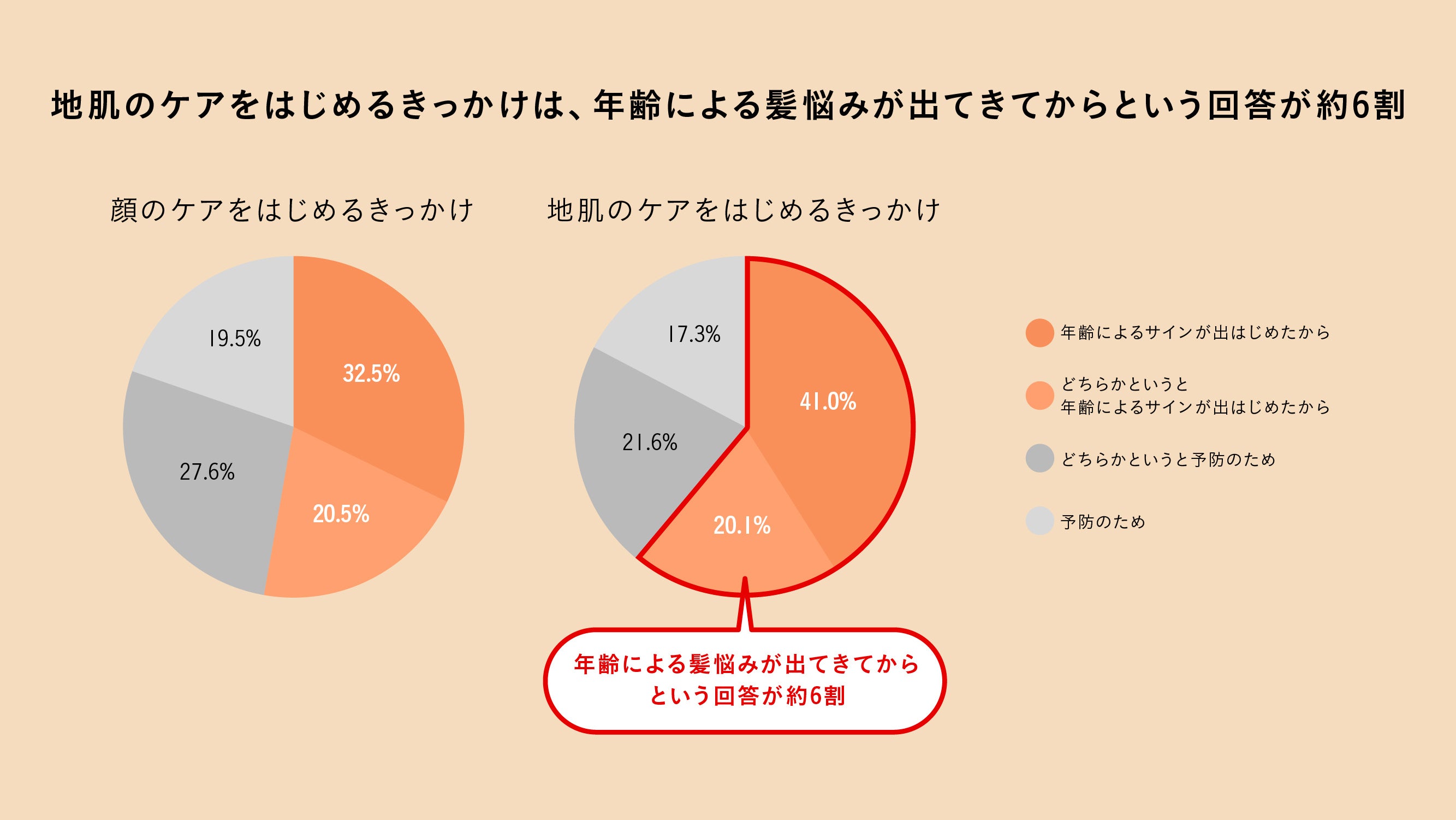 実際に顔のケアを行っている人のうち、はじめるきっかけとなったのは「年齢によるサインが出はじめたから(32.5%)」についで「どちらかというと予防のため(27.1%)」と現状への対策だけでなく、将来を見据えてはじめる人が多い結果となりました。しかし、地肌のケアを行っている人は「年齢によるサインが出はじめたから(41%)」についで「どちらというと年齢によるサインが出はじめたから(20.1%)」と、年齢による髪悩みが出たことをきっかけにはじめる人が多く、ケアをはじめる目的と意識にも違いがあることがわかりました。