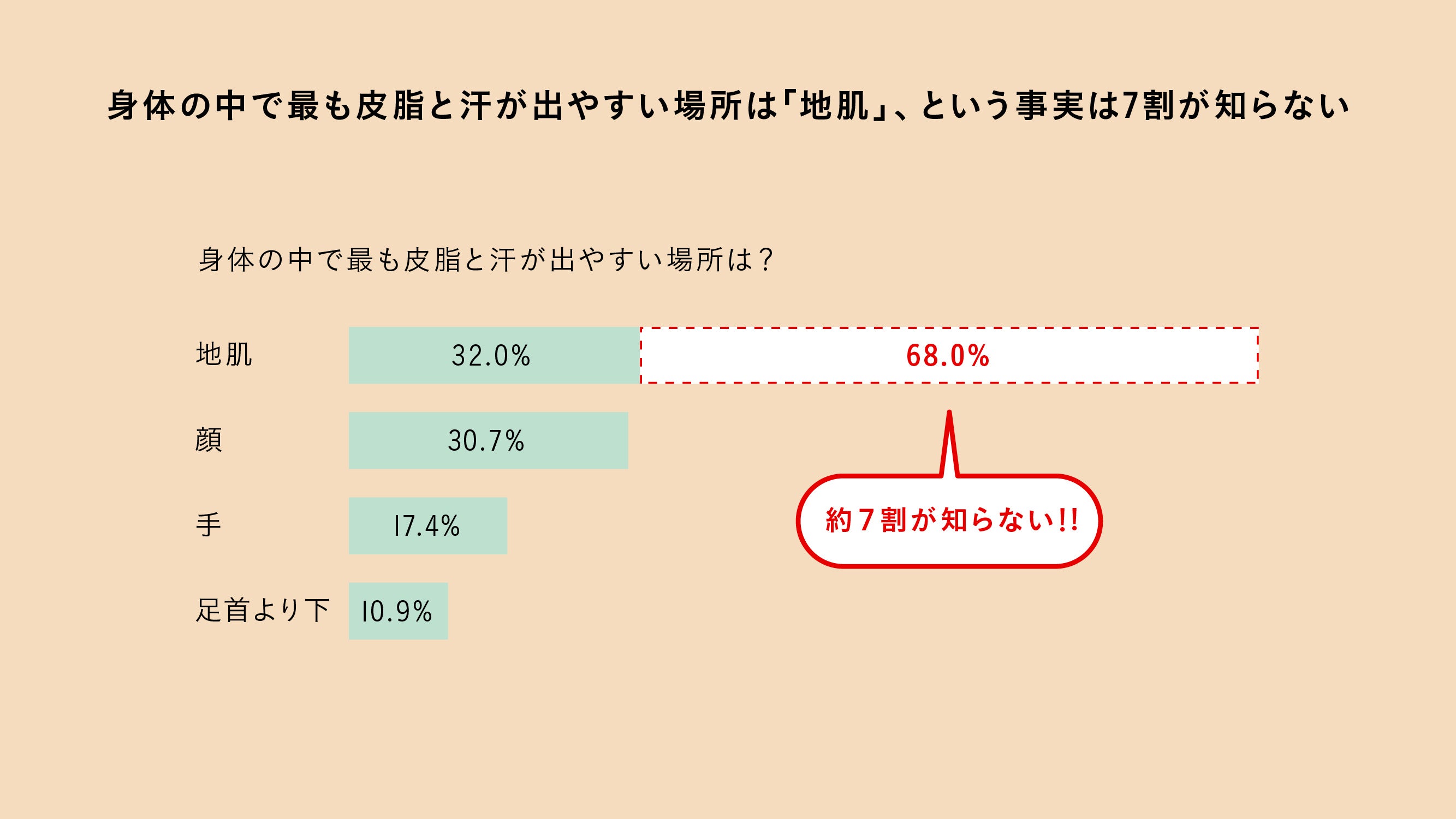 身体の中で最も皮脂と汗が出やすいところがどこだと思うかを質問したところ、約3割(32%)が地肌、についで「顔(30.7%)」「手(17.4%)」「足首より下(10.9%)」と回答。地肌は一般的に皮脂の分泌量が多いと言われる顔のTゾーンの2倍以上と、身体の中で最も皮脂の分泌量が多く、また汗腺は手のひらや足の裏に次いで多いため、1日に約700~900mLもの汗をかきますが、7割の人は地肌が最も皮脂と汗が出やすい場所とは認識していないという結果となりました。