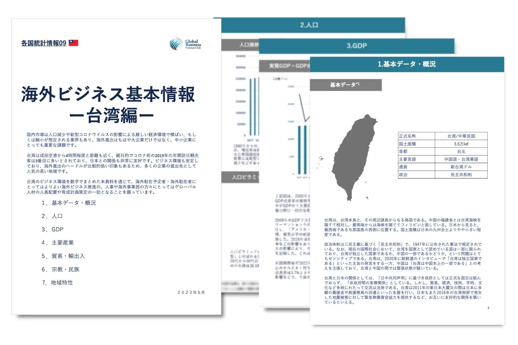 台湾のビジネス環境を数字でまとめた本資料を通じて、海外駐在予定者・海外駐在者に とってはよりよい海外ビジネス推進の、人事や海外事業部の方々にとってはグローバル 人材の人員配置や育成計画策定の一助となることを願っています。