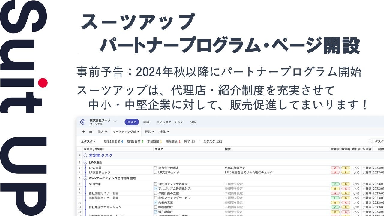 この度、株式会社スーツ(所在地:東京都千代田区、代表取締役社長CEO:小松 裕介)は、チームでかんたん、毎日続けられるプロジェクト・タスク管理ツールの経営支援クラウド「Suit UP」(スーツアップ)のサービスページに新たにパートナープログラム・ページを開設いたしましたので、お知らせします。