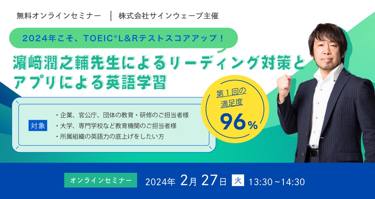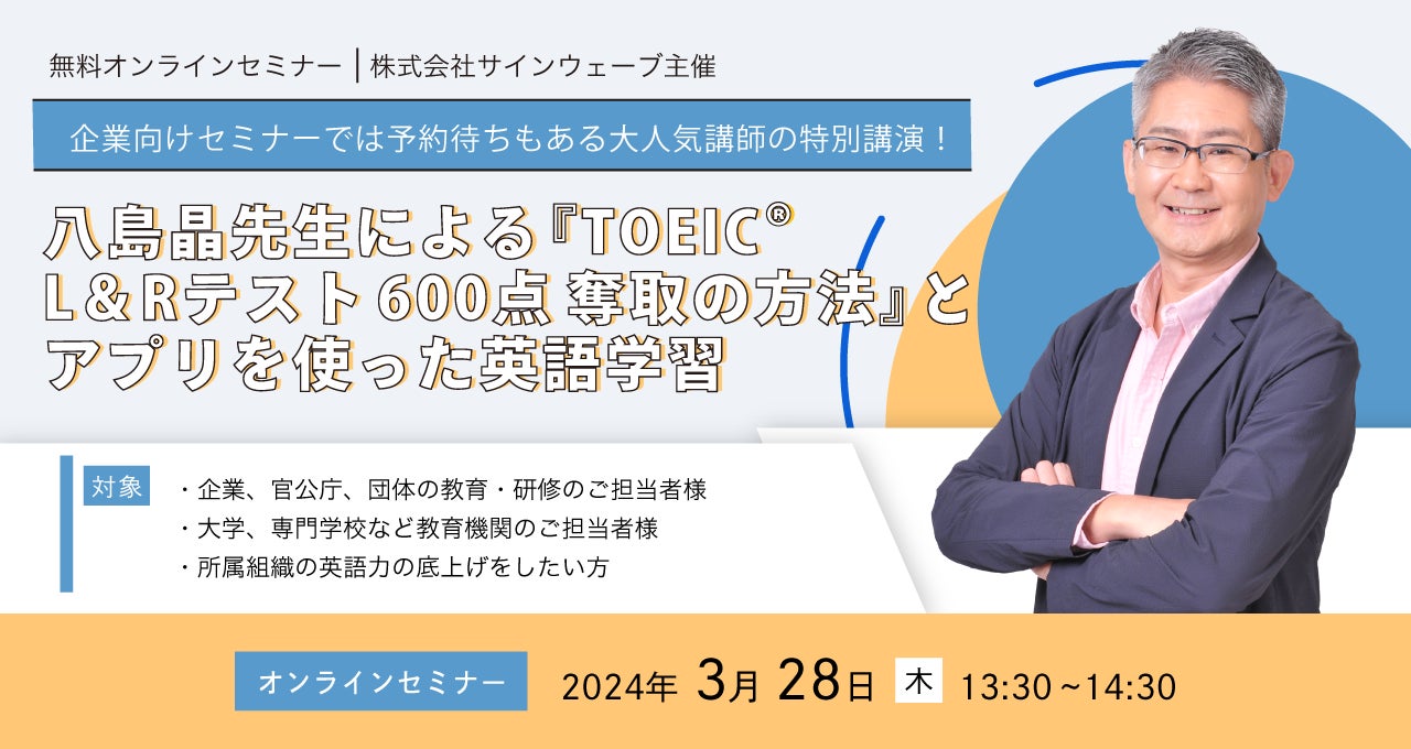 株式会社サインウェーブ(所在地:東京都千代田区、代表取締役:赤池雅光、以下サインウェーブ )は、人事・研修・教育関係者を対象とした無料オンラインセミナーを、2月27日(火)、3月28日(木)に連続開催いたします。プログラムは濱崎潤之輔先生、八島晶先生の特別講義に加え、大学生・社会人向け英語学習アプリ「ELST(R)Biz」を使った英語学習法や法人向けの導入イメージの説明を行います。