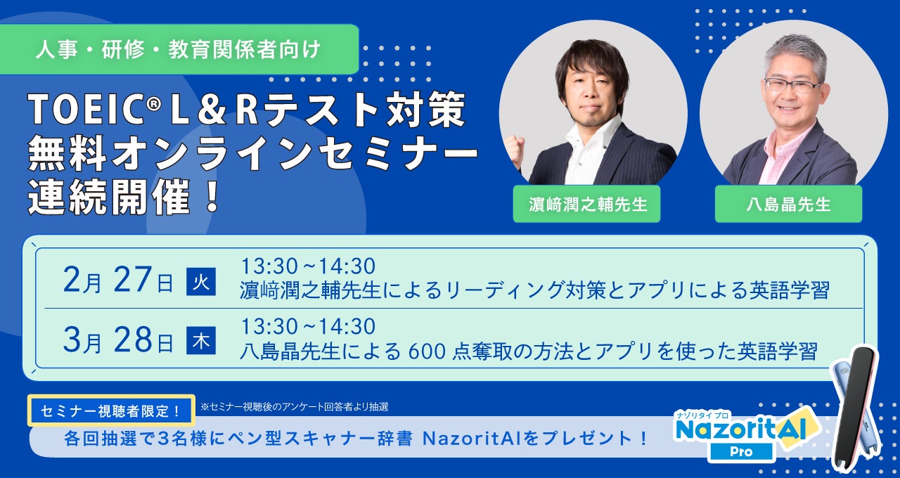 【TOEIC(R)L&Rテスト満点講師による連続セミナー開催】濱崎潤之輔先生、八島晶先生によるTOEIC(R)L&R TEST対策講義とAI自動採点アプリを使った英語学習とは?