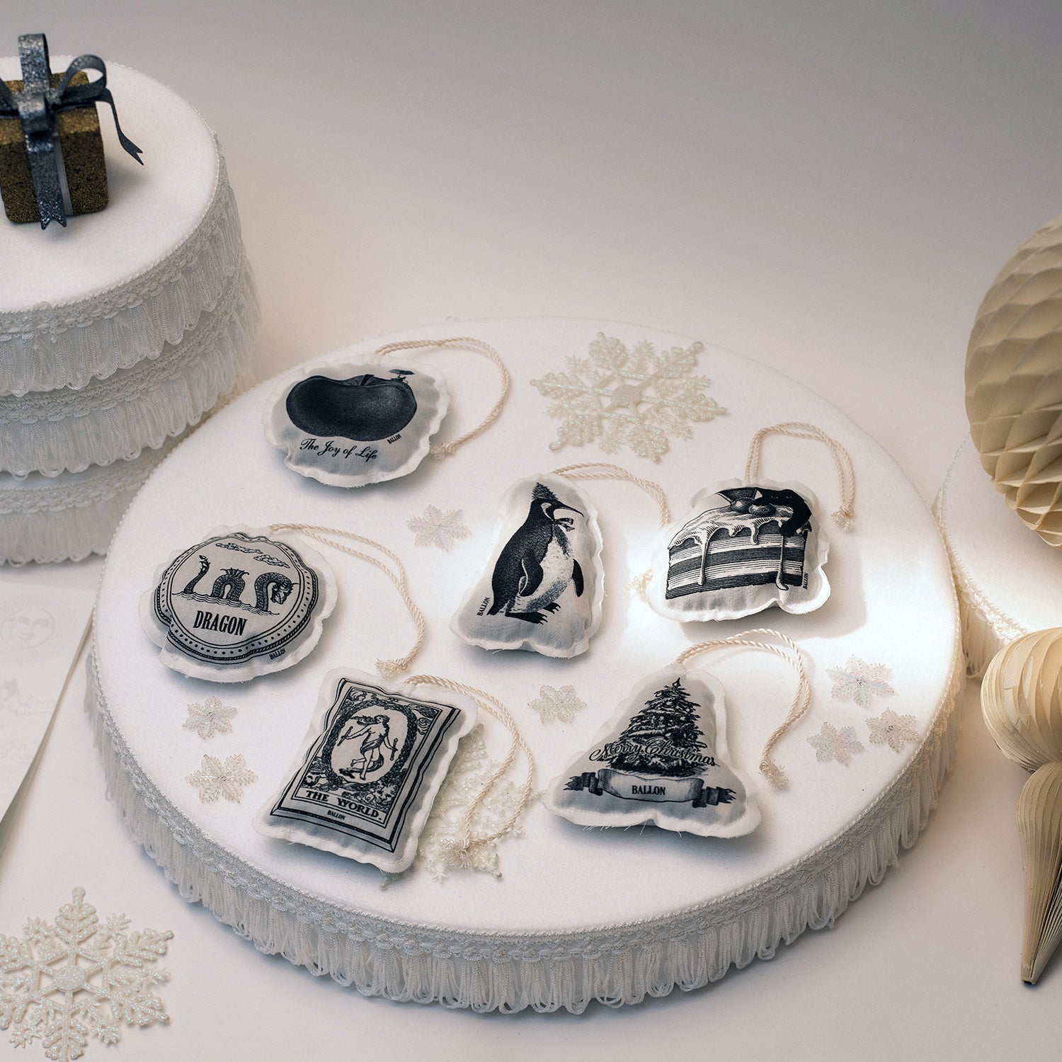 毎年人気のクリスマスツリーのオーナメントに最適なサシェオーナメント。純白のシルクコード&純白パッケージ仕様。来年の干支のドラゴンやタロットの最高のカード「THE WORLD」を始め、ラッキーモチーフをベースにした幸運を願うデザイン。