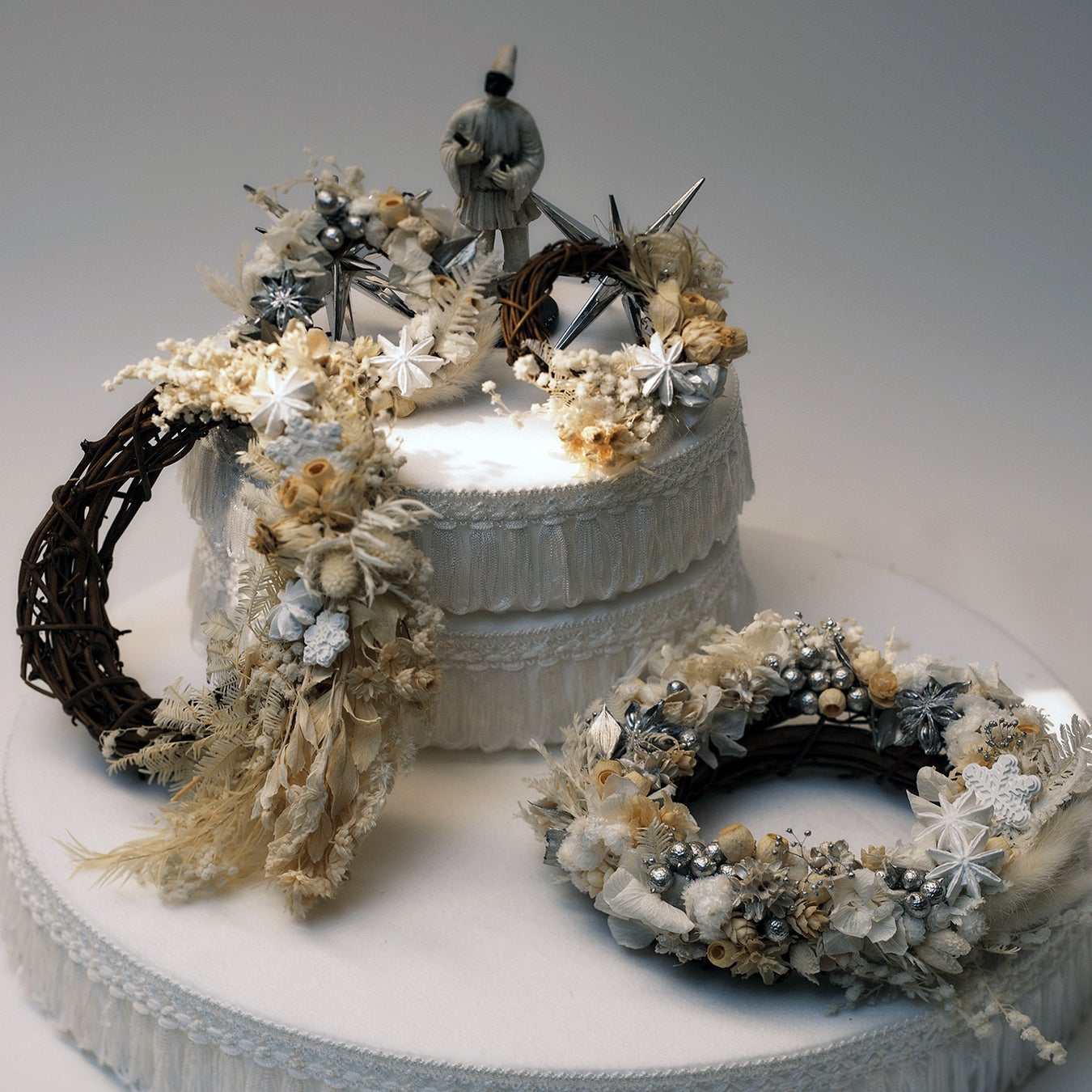 純白のドライフラワーやプリザーブドフラワーをベースに、スノーフレークや星に見立てたスターアニス型のアロマオーナメントがあしらわれた香りのクリスマスリースです。